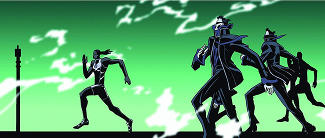 Scénarisé dans son intégralité par Yoshiaki Kawajiri (Programme) mais réalisé par le jeune prodige Takashi Koike (à qui l’on devra ensuite le fulgurant Redline et la partie animée du premier Kill Bill), Record du monde part d’une idée extrêmement intéressante : puisque les humains piégés dans la Matrice sont en réalité des sources d’énergie isolées dans des cuves liquides du monde réel, est-ce qu’une performance quelconque pourrait aboutir au réveil physique et mental de l’un d’eux ? Il n’est pas surprenant que le pitch de ce segment prenne place dans le milieu de la compétition sportive, plus exactement dans celui du 100m où un coureur tente de battre le record du monde et d’aller au bout de ses limites. Ceux qui ont déjà vu l’intéressant film à sketches Manie-Manie (coréalisé avec Rintaro et Katsuhiro Otomo) auront reconnu un lien implicite avec le court-métrage signé par Kawajiri, lequel déroulait son contenu très psy dans un contexte de course automobile à la Rollerball. Koike mange ici du même pain en mettant le pouvoir du mental et de la transcendance au cœur même de son récit, mais avec un style visuel clairement aux antipodes. Pour ce qui est de filmer l’exploit sportif, la silhouette humaine et les mouvements de ses muscles deviennent ici les cobayes d’un processus de déformation graphique : la première présente des mains et des pieds plus imposants que le reste du corps, tandis que les seconds nous donnent à voir l’action des glandes sudoripares à même la peau ! Tout ceci est bien sûr à rattacher à la grande école de l’expressionnisme, et il est tout à fait évident que le réalisme à l’état pur n’est pas ce qui caractérise cet épisode – on peine à imaginer Usain Bolt capable de courir le 100m en seulement 8.72 secondes ! Cela dit, avait-on déjà ressenti par le ralenti tout ce qui caractérise la motricité d’un corps humain lancé dans un effort physique extrême ? S’il y a un sacré exploit à relever ici, c’est bien celui-là : une animation mutante qui, par la force physique et l’incarnation du mouvement, réussit moins à transcender ses limites que les nôtres.