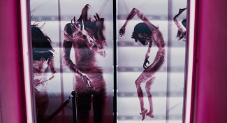 Autre détail à relever : sous un certain angle, Syd rappelle aussi bien le James Woods de Vidéodrome (un néo-laborantin manipulé et physiquement métamorphosé à force de jouer les pirates) que le Robert Pattinson de Cosmopolis (un rejeton de l’hyper-capitalisme dont le costume souillé et dénaturé symbolise la chute sociale). Or, ces deux figures-là, on se contentait d’observer leur déchéance, de mettre celle-ci en perspective afin d’en extraire une réflexion pertinente sur le devenir technologique du monde. Pas de ça chez Brandon Cronenberg qui, bien plus direct et explicite que son papounet, nous invite à épouser la déchéance physique et psychique de Syd. Antiviral est ainsi tout sauf un film agréable à voir. Il se fait même toujours plus inconfortable à mesure que sa narration joue sur l’arythmie, le ralentissement de son énergie interne, la fragilité du corps de son anti-héros omniprésent dans chaque plan. L’allégorie futuriste aura tôt fait de lorgner vers le thriller parano, très précisément quand surgit l’élément déclencheur du récit. Une fois que le nouveau virus qu’il s’est injecté fait disjoncter sa machine extractrice, Syd devient autant un pion manipulé qu’un insecte difforme et convulsif, ballotté d’un état à l’autre tel un corps manipulé qui se verrait passé au microscope à chaque nouveau stade de dégradation (grande scène de la « chambre des vérités »). Et de ce fait, la dépendance organique en action fait de chaque scène une machine à générer de l’horreur graphique, dans un alliage de gore arty qui tâche et de bande-son électro-dark qui fait bouillir les tripes. Même les décors eux-mêmes, signes de l’identité première du film tout entier, subissent cette métamorphose : leur blancheur immaculée, d’abord marquée par un goût de l’épure et des cadres géométriques quasi kubrickiens, se laisse peu à peu teinter de noirceur, voire d’un rouge profond. En somme, tandis que le rouge organique tâche le blanc technologique, un corps devient toujours plus blanc à mesure qu’il se vide de son liquide rouge. Ainsi va le projet viral de Brandon Cronenberg, destiné à relier viscéralement le film lui-même à son cobaye (héros/spectateur) : tels des vases communicants, les vibrations et les soubresauts de l’un deviennent ceux de l’autre.