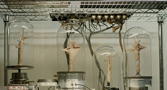 Le protagoniste du film, celui qui va faire l’expérience d’une dichotomie entre contamination et sublimation, peut clairement être assimilé à un double de Brandon Cronenberg. Une lecture qui n’a rien d’exagéré, dans la mesure où ce dernier avouait avoir eu l’idée du film en théorisant sur la personnalisation d’une maladie grippale qu’il avait contractée (qui l’avait créée ? quel visage pourrait-elle avoir ?). Syd est ainsi l’un des employés d’une des cliniques précitées, mais sur son temps libre, il est avant tout un pirate qui a développé son petit business parallèle. En effet, il revend des échantillons de ces virus à des trafiquants, d’abord en les injectant dans son propre organisme (ce qui l’expose à une série d’effets secondaires qu’il parvient toutefois à éradiquer par la suite), ensuite en les extraire et en les transformant via une machine spécialisée qu’il cache illégalement chez lui. Cette machine, parlons-en un peu : elle donne à la maladie partagée une « image », une sorte d’identité faciale déformée qui, en tant que telle, évoque le ressenti d’un état maladif. Et cet état-là, c’est peu dire que le personnage l’incarne dès sa première apparition : un thermomètre dans la bouche, une silhouette recroquevillée sous un épais manteau, une peau laiteuse qui fait corps avec la grisaille environnante du décor urbain, un timbre vocal rauque qui mâche les mots, des tâches de rousseur qui frisent la gangrène cutanée… Sous la panoplie du costard-cravate froid à la Patrick Bateman, Syd est déjà un cadavre ambulant, rongé par on ne sait quel virus insidieux, et dont l’état ne va pas aller en s’arrangeant – c’est un euphémisme. Le choix du jeune acteur Caleb Landry Jones se révèle tout à fait adéquat, tant son look androgyne, son faciès inquiétant et sa démarche toujours plus boiteuse aident à renforcer le malaise exponentiel du personnage.