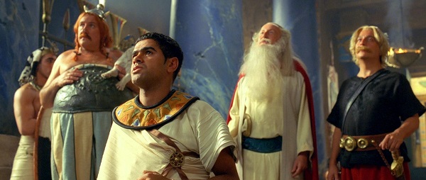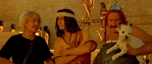 Parce qu’il est ici question d’un voyage hors de Gaule, la première stratégie à l’œuvre aura consisté à user de ce paradoxe suprême qui veut qu’Astérix et Obélix soient peints comme de simples touristes lâchés en territoire inconnu. Chabat ayant bien saisi que la structure des meilleurs albums tendait à faire du duo principal le faire-valoir passif d’un entourage actif, voilà nos deux superstars d’acteurs majoritairement amenées à commenter l’action et l’univers plutôt qu’à en être le moteur direct. En l’état, c’est peu dire que cet art de la discrétion et de la modestie sied génialement bien à un Clavier enfin délesté de ses tics de cabotin et à un Depardieu apte à utiliser sa seule posture de colosse comme ressort comix. Mais surtout, à l’instar de ce que suggérait la réplix-clé que l’on évoquait en début de critix, Astérix et Obélix finissent par devenir les dindons de leur propre farce à mesure qu’ils posent un regard ironix sur cette pure Egypte de bande dessinée. Sont-ils donc les « intrus » de la grande aventure qui se voudrait la leur mais qui ne cesse de leur échapper ? En tout cas, tout est fait pour y faire croire. Point de fibre gauloise dans le décor, si ce n’est un plan fixe sur la hutte enneigée de Panoramix qui restera ici la seule vue globale sur le village des irréductibles. Pas même de réelle nouveauté tangible dans les célèbres dialogues entre le petit guerrier à casque ailé et le gros… PAF !!!… euh, le livreur de menhirs un peu enveloppé, vu que ceux-ci sont ici retranscrits à la virgule près, et pas forcément avec l’énergie nécessaire qui permettrait de les rendre moins familiers que prévu – c’est bien là le seul « reproche » que l’on serait en droit de faire au scénario écrit par Chabat. Sans surprise, toute la marmite de potion magix est donc ici allouée à cette smala de satellites délirants qui gigotent en orbite dans ce foutoir pharaonix.
