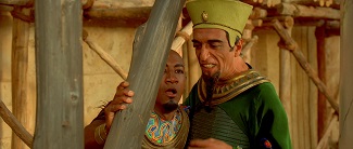 Parce qu’il est ici question d’un voyage hors de Gaule, la première stratégie à l’œuvre aura consisté à user de ce paradoxe suprême qui veut qu’Astérix et Obélix soient peints comme de simples touristes lâchés en territoire inconnu. Chabat ayant bien saisi que la structure des meilleurs albums tendait à faire du duo principal le faire-valoir passif d’un entourage actif, voilà nos deux superstars d’acteurs majoritairement amenées à commenter l’action et l’univers plutôt qu’à en être le moteur direct. En l’état, c’est peu dire que cet art de la discrétion et de la modestie sied génialement bien à un Clavier enfin délesté de ses tics de cabotin et à un Depardieu apte à utiliser sa seule posture de colosse comme ressort comix. Mais surtout, à l’instar de ce que suggérait la réplix-clé que l’on évoquait en début de critix, Astérix et Obélix finissent par devenir les dindons de leur propre farce à mesure qu’ils posent un regard ironix sur cette pure Egypte de bande dessinée. Sont-ils donc les « intrus » de la grande aventure qui se voudrait la leur mais qui ne cesse de leur échapper ? En tout cas, tout est fait pour y faire croire. Point de fibre gauloise dans le décor, si ce n’est un plan fixe sur la hutte enneigée de Panoramix qui restera ici la seule vue globale sur le village des irréductibles. Pas même de réelle nouveauté tangible dans les célèbres dialogues entre le petit guerrier à casque ailé et le gros… PAF !!!… euh, le livreur de menhirs un peu enveloppé, vu que ceux-ci sont ici retranscrits à la virgule près, et pas forcément avec l’énergie nécessaire qui permettrait de les rendre moins familiers que prévu – c’est bien là le seul « reproche » que l’on serait en droit de faire au scénario écrit par Chabat. Sans surprise, toute la marmite de potion magix est donc ici allouée à cette smala de satellites délirants qui gigotent en orbite dans ce foutoir pharaonix.