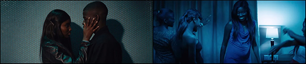 Il est ainsi frappant, sinon tragique, de constater l’amoindrissement radical du bleu dans la dernière partie du film qui remet en cause le personnage de Marieme dans son intégralité : un corps instrumentalisé et masculinisé ; son libre arbitre se heurte à la menace du cercle dans lequel elle évolue désormais. La bande de fille s’est évanouie et celle-ci devient la proie de couleurs agressives, le rouge vif de sa robe notamment – couleur absente jusqu’alors. L’innocence refait surface par intermittence, dans un retour timide de nuances bleutées qui agissent comme des réminiscences systématiques quand une complicité renaît. Une tension sourde anime le dernier acte, point d’aboutissement d’une angoisse croissante tout au long du film, au fur et à mesure que la réalité sociale ramène les personnages dans l’impasse de la banlieue.