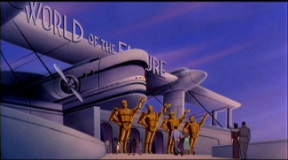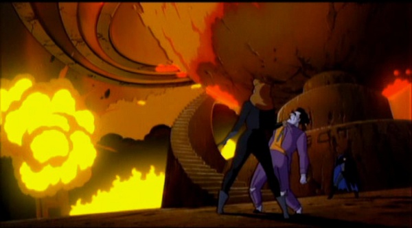 Au gré de ce renvoi de personnalité, Batman Contre Le Fantôme Masqué se construit comme une tragédie sur deux êtres que les circonstances ne pourront jamais réunir. La fin les laisse ainsi isolés. L’une sur un bateau en exil, l’autre enterré au fond de sa sombre grotte. Les deux n’ont plus que des regrets à partager. Il est d’ailleurs à noter que ces choix de décors ne sont pas les seules idées ingénieuses imaginées par la mise en scène. L’environnement dans lequel évoluent les personnages est souvent conçu avec soin. La première rencontre du couple a lieu dans un cimetière comme pour indiquer que l’idylle est enterrée d’avance. De manière plus récurrente, l’intrigue nous renvoie plusieurs fois à une exposition universelle. Dans les flashbacks, celle-ci nous ramène à une vision idéalisée du futur dans lequel convolent les tourtereaux. Au temps présent, on retrouve le décor en ruine et squatté par le Joker. Un état des lieux, en quelque sorte, de la relation présente des personnages dont l’esprit est gangréné par le même complexe. D’ailleurs si on prend en compte que la série est le prolongement des films de Burton, le Joker est le géniteur des deux héros masqués. Il sera également leur fossoyeur puisqu’en faisant exploser la place lors du climax, il réduira en cendres le lien entre les deux amoureux.