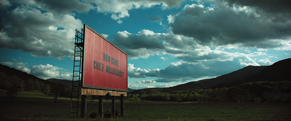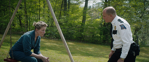 Tout est là dès les premiers plans du générique : trois panneaux à l’abandon, délabrés et esquintés, qui trônent dans une plaine parcourue par le brouillard, le tout au bord d’une route où personne ne circule et avec de la folk mélancolique en fond sonore. A priori, pas l’endroit rêvé pour placarder une information destinée à être propagée le plus possible. Sauf qu’à bien y regarder, les traces de l’ancien placardage sont encore là, sur quelques planches de bois esquintées : on y distingue une vieille publicité des années 80 avec un petit bébé heureux – la marque du produit à vendre n’est en revanche pas claire. Cela dit déjà tout de l’Amérique que Martin McDonagh souhaite ici évoquer : un monde autrefois simple, heureux et insouciant, qui semble avoir été délaissé par on ne sait plus trop quelle désillusion – laissons aux spécialistes de l’époque le soin de compléter cette phrase. Si ces trois panneaux donnent leur nom au film, c’est parce qu’ils sont autant une arme de résistance face à l’oubli qu’un symbole enraciné de cette désillusion. Il en sera de même lorsqu’ils seront recouverts de rouge et de noir – couleurs de la vengeance – avec un texte impitoyable destiné à une justice qui porte visiblement mal son nom. Ce texte bien calculé à l’avance, c’est Mildred Hayes (Frances McDormand) qui l’a voulu, désormais incapable de contenir sa colère depuis que la police n’a pas su retrouver celui qui a violé et tué sa fille quelques mois auparavant. Et c’est au responsable de l’enquête, à savoir le shérif William Willoughby (Woody Harrelson), qu’elle l’adresse ouvertement. Une vengeance par le mot qui remplace une vengeance par le flingue : ça peut sembler plus efficace pour réveiller l’opinion, ça l’est en revanche dix fois plus pour se le mettre à dos.