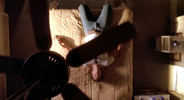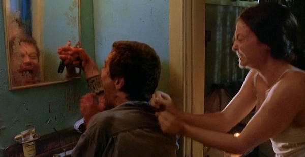 Autant dire que, dans Bug, chaque regard, chaque geste, chaque ligne de dialogue et chaque intention de la mise en scène sera à double, à triple, voire à quadruple sens. Outre une gestion de l’espace prodigieuse pour un récit se déroulant à 95% dans une seule pièce, la mise en scène de Friedkin se caractérise avant tout par une caméra mobile, presque vivante et personnalisée, qui s’adapte aux sursauts des personnages et déploie une viscéralité rare. On peut presque y voir une personnalisation de ce « virus », épiant les protagonistes de façon menaçante et troublant la vérité de la séquence avec des effets de montage très astucieux. A titre d’exemple, l’assimilation fréquente d’un bruit d’hélicoptère diffus avec le mouvement du ventilateur de la chambre possède une triple signification : la cristallisation d’un trauma potentiel plus ou moins lié à la guerre, la présence d’une menace en spirale qui va s’abattre sur les deux héros, et un clin d’œil direct à la scène d’ouverture d’Apocalypse Now qui installe d’emblée une forme de chaos inéluctable au cœur de l’action par un jeu de montage avec un ventilateur cloué au plafond. Et même lorsqu’il s’agit de capter quelques bribes du quotidien d’Agnes, l’incertitude se mue légèrement en menace : une simple publicité posée sur un pare-brise (mais pas sur les autres voitures voisines), des coups de téléphone avec personne à l’autre bout du fil, un radiateur qui crache de l’air frais avec plus ou moins d’intensité, et ne parlons pas du mari violent, parfois hilarant dans ses répliques, et dont la silhouette, surgissant de la buée de la salle de bain tel un monstre surnaturel, brouille les pistes du réalisme pur.