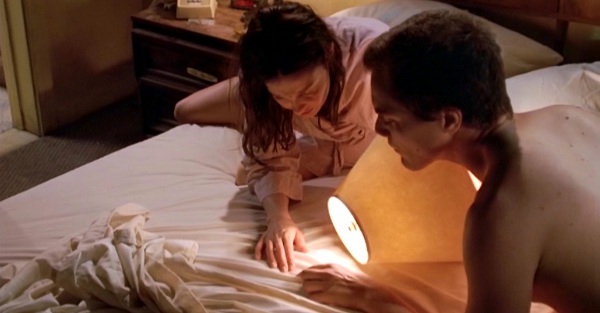 La symbiose de tous les genres cinématographiques se traduit ici par un brouillage permanent de leurs codes, voire une fusion absolue entre ceux-ci à la manière d’un plat de spaghettis où tout serait mêlé jusqu’à l’imperceptible. Du coup, difficile de ne pas ressentir un terrible malaise lorsque la situation redouble d’intensité : au fur et à mesure que Peter sombre dans la folie et répercute ses effets névrotiques sur Agnes, le cinéaste donner à cette folie une incarnation à la fois terrifiante et délirante, ce qui n’exclut pas l’humour et la cocasserie trash. Non pas qu’un coude étudié au scalpel ou un arrachage de molaire sans anesthésie puissent susciter le fou rire, mais le grotesque vient souvent toquer à la porte lors de ces scènes à la violence tétanisante, avec, comme épicentre de cet incroyable pétage de plombs, le calvaire vécu par deux êtres désormais branchés sur la même longueur d’onde. Dès lors, un autre niveau de lecture s’impose à propos de ce processus de contagion : deux entités biologiques qui s’autodétruisent pour ne former qu’un seul et même corps. Cela apparait évident au fil des séquences : Agnes étant tombée amoureuse de Peter, elle est désormais prête à tout pour ne pas le perdre, et Peter semble tellement désireux d’extraire ce « virus » qu’il en arrive à scarifier son propre corps. Dans ces instants, Bug vire du côté de la fable névrotique et kafkaïenne autour d’une métamorphose organique, et la magnifique scène de sexe entre Agnes et Peter en constitue à la fois la synthèse comme la première pierre de leur folie partagée : deux corps faisant la bête à deux dos, une sensation de moiteur et de fusion absolue, des plans fondus de salive et de sueur mêlées, cristallisant ainsi une véritable contamination réciproque qui va prendre des proportions inimaginables. Ce qui pousse alors Friedkin à orienter la folie de la situation sous un angle purement romantique.
