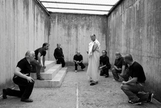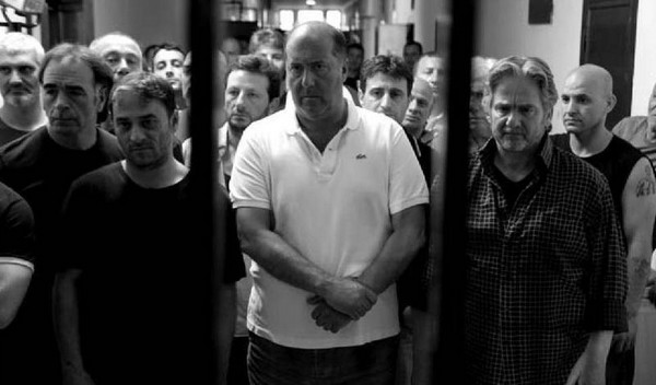 A ce stade, César doit mourir n’est encore qu’un drôle de documentaire. Mais dès lors que les lectures de la pièce débutent, les niveaux de lecture du film apparaissent et s’entremêlent aussitôt. Entre les prisonniers en train de jouer et les sénateurs romains en train de comploter, le jeu d’échos est permanent, parfois presque étourdissant. Ce trouble est permis et accentué par le recours intelligent au noir & blanc, qui fait des condamnés des figures presque mythiques, hors du temps et donc plus ambiguës, aux statuts plus interchangeables, et de la prison de Rebibbia un espace moins nettement identifiable que si des images en couleurs étaient venues en montrer les teintes (eh non, du ciment en couleur et du ciment en noir & blanc, ça n’a pas la même allure). La musique, signée par Giuliano Taviani, le fils de Vittorio, participe elle aussi de ces fluctuations : ses mélodies mélancoliques au saxophone peuvent d’un moment à l’autre prendre un souffle autrement dramaturgique grâce à un accompagnement orchestral opulent. Peu à peu, c’est l’espace entier de la prison qui glisse vers le décor de théâtre : les séquences se déroulant dans la cour intérieure (l’assassinat de César, les discours successifs de Brutus puis de Marc-Antoine) sont les plus beaux moments de tiraillement du film, entre le souffle du texte et de son interprétation remarquable (renforcé par la beauté du noir & blanc et par la musique donc) et la réalité de l’emprisonnement des acteurs que l’on ne peut oublier lorsque les Taviani filment la scène en plongée, à travers une sorte de toit grillagé qui décourage toute tentative d’évasion.