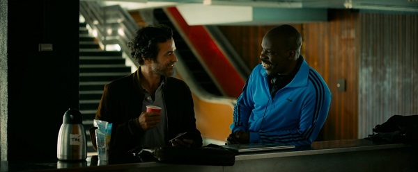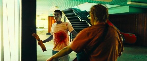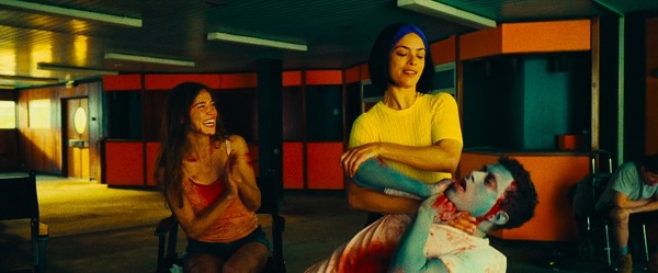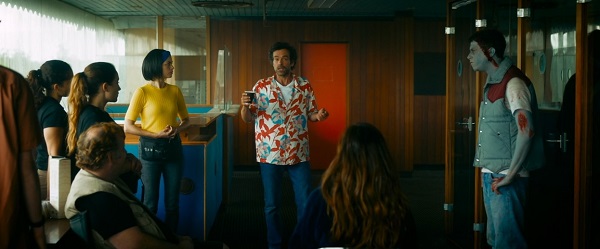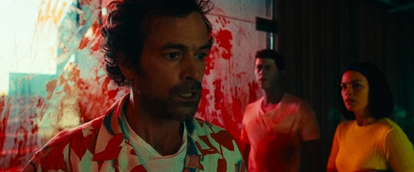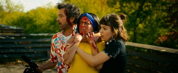 Tout ce que met en place Hazanavicius d’un bout à l’autre des deux derniers segments de son film (préparation et tournage) impose assez de scénographie punchy et de choix de découpage subtils pour ratatiner et enterrer plus bas que terre tout ce que le film d’origine avait essayé d’installer. Le décor, d’abord : en lieu et place de cette vieille et minuscule usine de traitement de l’eau, on récolte ici un vaste bâtiment administratif et désaffecté sur plusieurs étages (une usine ? un lycée ? un centre commercial ?) que la caméra ne cesse de topographier pour bâtir un pont entre deux scènes (celle où l’on joue et celle où l’on contrôle). La photo, ensuite : adieu cette esthétique DV délavée digne de celle dont Uwe Boll avait tant abusé durant ses années de méfaits filmiques, et bonjour à un Scope bicéphale à gogo qui retapisse la partie fictionnelle aux couleurs du genre (rouge vermillon, vert bouteille et jaune canari avec un contraste amplifié) quand il ne traite pas la partie réelle avec une maîtrise visuelle des plus optimales. Les acteurs, enfin : que des pros de l’incarnation in vitro qui s’éclatent à lézarder la logique de leur personnage à mesure que le film dans lequel ils jouent part en sucette. D’un côté, Matilda Lutz pastiche aussi bien la pythie vengeresse et ensanglantée de Revenge que la bimbo décervelée et préoccupée par ses followers sur Instagram, Finnegan Oldfield s’éclate à jouer le connard arrogant qui s’auto-persuade de sa lecture sous-jacente de la figure du zombie (quitte à se prendre pour le Romero du pauvre en improvisant des slogans marxistes et anticonsuméristes en pleine action !) et Bérénice Bejo met toute la smala à très rude épreuve par une propension au lâcher-prise et au sadisme qui participe au délire. De l’autre, le réalisateur joué par Romain Duris passe par tellement d’états possibles qu’on y décèle vite un autre niveau de lecture : à la fois cinéaste sisyphéen, époux dépassé, père maladroit, créateur conscient de la fragilité de son art et contemporain gaffeur vis-à-vis du monde qui l’entoure, il est la somme de tous les protagonistes de la filmo d’Hazanavicius, de Mes amis jusqu’au Prince oublié en passant par OSS 117, The Search et Le Redoutable.