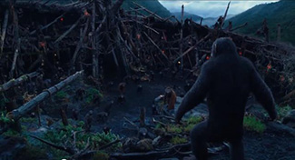 Le visuel est logiquement soumis aux mêmes contraintes. Matt Reeves démontre pourtant à de multiples reprises sa maîtrise en la matière. Le tournage majoritairement en extérieur en est la preuve. Il s’agit là bien d’un choix pensé au regard des besoin de la narration et non pas juste d’une pose vis-à-vis des diaboliques CGI qui envahissent tous. En ce sens, le cinéaste montre une confiance exemplaire dans le potentiel de la performance capture. Il faut dire que celle-ci approche de plus en plus de la perfection. Le plan d’ouverture et de clôture balaie d’ailleurs avec force les critiques faites du temps des expérimentations de Robert Zemeckis sur les yeux sans vie de ses personnages. A tout ceci, il rajoute d’ingénieuses idées de plan : l’attaque filmée en accompagnant le mouvement circulaire de la tourelle (traduisant là le sentiment d’une évolution mais qui revient toujours à son point de départ), l’ultime échange entre homme et singe résumant le destin de chacun (les ténèbres pour l’un et l’aube pour l’autre), l’iconisation finale dont la structure pyramidale renvoie aux œuvres de Frazetta…