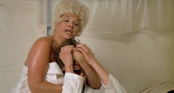 Si la forme colle autant au fond, c’est qu’elle saisit un décor qui paraît lui-même refléter les émotions du personnage. Le cadre en question est presque uniquement réduit à ces bains publics dans lesquels Mike et Susan tiennent les cabines privées où des clients viennent faire leur toilette. Ce n’est pas vraiment prévu dans le règlement mais Susan le pose comme acquis dès qu’elle explique le fonctionnement de la maison à Mike : apporter à un(e) client(e) une serviette ou tel shampoing peut être propice à quelques minutes de plaisir et permettre d’empocher un « pourboire ». Bien vite, les bains prennent des allures de maison close de fortune. Et chaque porte paraît renfermer, pour l’adolescent, une nouvelle expérimentation, une nouvelle étape dans sa découverte plus ou moins facile du désir (pas forcément le sien, celui des autres aussi). On pense à Fellini – et en particulier à Amarcord (1974) – lorsque surgit une cinquantenaire peroxydée aux formes plus que généreuses (Diana Dors) qui, à la faveur de l’atmosphère surchauffée, brutalise Mike en s’abandonnant à ses fantasmes, criant des noms de joueurs de football pour se croire dans un vestiaire. Skolimowski nous offrira d’autres scènes mémorables au parfum de scandale, face auxquelles nous nous trouveront déstabilisé, partagé entre l’amusement et la gêne : au bord du grand bassin, un prof de sport met ses étudiantes à l’eau une à une en leur mettant une main aux fesses ; plus tard, un groupe de jeunes assaille Mike de remarques salaces sur sa collègue. Lorsque l’on sortira enfin des bains pour arpenter, la nuit, les rues de Soho, c’est chez une prostituée elle aussi à forte libido que l’on finira, confirmation que la mécanique du désir-roi déborde l’espace clos de la piscine pour guider presque le moindre agissement, la moindre rencontre du protagoniste, et ce malgré lui. Les vapeurs des bains se verront alors remplacer par les lumières toxiques des néons multicolores, qui paraissent elles aussi figurer un trouble de la perception du réel…