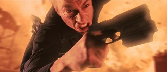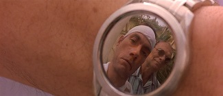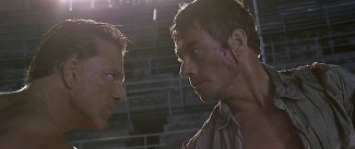 Toute la seconde moitié du film a tôt fait de s’imposer en gigantesque jeu de plateforme, dans lequel Van Damme fait presque figure de boule de flipper qui passe d’une péripétie à l’autre – la posture oscillante et élastique de l’acteur reste plus que jamais affaire de mise en scène. Parallèlement à cela, Tsui Hark élabore une mise en scène éminemment schizo, jouant à loisir sur l’enfilade de faux-semblants et s’efforçant de réorganiser toute situation confuse par la seule énergie de sa caméra. Le premier signe de cette démarche, avouons-le, intervient en réalité bien avant l’épisode de la Colonie, lors de la fameuse interpellation ratée de Stavros par l’équipe de Quinn. Cette séquence, située dans une fête foraine, met ainsi en scène une filature entre plusieurs agents secrets qui s’achève par une fusillade survoltée au cœur d’une foule bondée. Toute la science de Tsui Hark irradie alors : éclatement de la continuité spatiale et temporelle (le changement d’angle fait jeu égal avec le faux raccord, le ralenti s’incruste dans le mouvement), ambiance surchargée de signaux divers et épileptiques (animaux, flashs, bruits, masques…), protagoniste-spectateur qui doit faire un effort visuel et psychique afin de trier ce qui doit l’être au cœur du chaos (quel est le rôle de qui ? qui tire sur qui ? quel est mon ennemi ?). La présence d’un tigre en cage dans cette scène suffit d’ailleurs à clarifier tout ce qui anime le duel Quinn/Stavros : un « œil du tigre » à double visage qui adopte une gestuelle quasi-féline dans l’espace de combat. Et quand bien même Stavros fait mine d’avoir l’avantage sur Quinn à force d’être capable de relayer sa propre animalité de part et d’autre (voir comment son regard semble communiquer avec celui du tigre en cage), sa propension à provoquer le chaos au lieu de l’éprouver – ne serait-ce qu’en promettant la mort du fils de Quinn pour venger la mort du sien – a tôt fait d’être perçue comme un leurre fatal. Et c’est donc en devenant gladiateur immobilisé face au félin en liberté qu’il signera sa perte en tant que Némésis fatiguée de Quinn lors du dénouement final, sorte d’hommage mongoloïde au duel Lee/Norris de La Fureur du dragon, où l’on essaie de faire passer les arènes d’Arles pour un Colisée romain blindé de distributeurs de Coca-Cola – énième signe d’un globe terrestre où tout est brouillé et/ou bidonné.