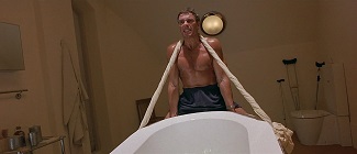 Alors, forcément, dès l’instant où notre JCVD adoré se décide à prendre la poudre d’escampette, c’est le signe d’une émancipation bigarrée – et donc d’une possible réactualisation du statut d’agent secret – qui semble apparaître à l’horizon. Le processus s’opère en deux temps. D’abord par un registre qui n’étonnera pas un seul des fans hardcore de l’acteur belge : l’entraînement WTF en mode Kickboxer ou Bloodsport, qui consiste à montrer Van Damme – bien sûr quasiment à poil – se tataner avec des ustensiles divers (tiens, des seaux tenus par des ficelles !) ou faire des abdominaux en soulevant une baignoire remplie d’eau ! Ensuite par un revival des grands moments du film d’espionnage, afin de montrer que les codes les plus éculés du genre n’ont peut-être pas dit leur dernier mot. Ici, on en prend très vite le pouls avec Quinn qui s’évade de la Colonie à la manière d’un Timothy Dalton s’accrochant à un ballot de marchandises tracté par un avion-cargo en plein vol – petit clin d’œil nostalgique à Tuer n’est pas jouer. Mais une fois revenu sur la terre ferme, la question se pose alors : quel peut être le rôle et la mission de l’agent secret ? C’est le titre du film qui nous chuchote la réponse : tout devient alors « double ». On ne remplit plus la mission tout seul mais à deux, on n’obéit plus à un service secret précis mais on pioche dans le catalogue (voire même dans l’underground planétaire), et surtout, on tire profit du chaos généralisé afin de remettre l’humain en tant que préoccupation n°1. Ainsi donc, le monde n’a plus à être sauvé car l’abolition de ses frontières en a déformé le visage, et sauver l’humanité = sauver sa progéniture. De facto, Double Team fuit ainsi la trame du récit d’espionnage lambda pour redéfinir le sens des priorités dans un monde devenu un chaos à ciel ouvert. Et ça tombe bien : le mot « chaos » est celui qui vient systématiquement en tête dès que l’on se met à évoquer Tsui Hark. Parce que dès qu’il s’agit de filmer par des (dé)cadrages et d’incarner par des choix de découpage tout ce que ces cinq lettres peuvent signifier, on sait très bien qui est le maître du monde.