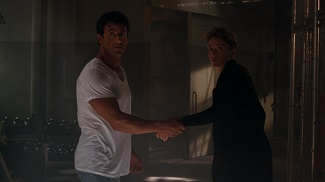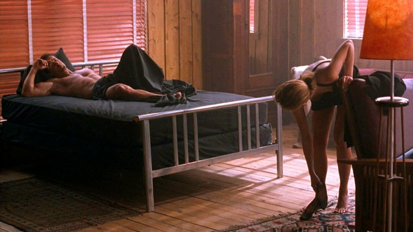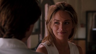 Reconnaissons d’entrée les travers d’un film hybride qui, à bien des égards, tenait plus de l’astuce marketing que du cinéma à l’état pur. Réalisateur d’origine péruvienne, déjà remarqué à l’époque pour une série B basique avec Tom Berenger (Sniper) puis ridiculisé par une série Z pathétique avec Jennifer Lopez (Anaconda), Luis Llosa endosse ici la panoplie de la serpillière malléable d’un studio ayant flairé la bonne affaire, et se contente ainsi d’aligner les scènes comme autant de cases à cocher sur une liste d’impératifs. Vu qu’on imagine mal le studio se satisfaire de voir l’interprète de Rambo réduit pendant deux heures à bidouiller des bombinettes dans un hangar pouilleux ou à les faire péter en restant immobile dans un coin du décor, l’astuce pour enrichir le rayon action consiste ici à rajouter une scène totalement gratuite et parfaitement ridicule, où Stallone démolit une bande de loubards malpolis dans un bus – faire exploser des bombes ne le prive donc pas d’exploser des gueules – sous l’œil ravi des autres passagers. Au rayon sexe, le problème se pose aussi : comment donner dans le plan qui émoustille sans risquer la terrible sanction NC-17 ? C’est assez simple : on attend la seconde moitié du film pour que les deux stars d’affiche se rencontrent enfin, et avant ça, on patiente en laissant Stallone reluquer chastement Sharon Stone à distance et entendre son envoûtante voix de sirène au téléphone (ou au walkman en faisant torse nu ses exercices du matin). Au son, ça donne des trucs du style « J’aime votre voix – Moi aussi, j’aime votre voix » ou encore du genre « Vous me suivez toujours, n’est-ce pas ? C’est comme si je vous sentais – Ça fait partie du boulot ». On a déjà les zygos qui surchauffent plus vite que le fond du caleçon. Ceux qui préfèrent les messageries roses au coït lui-même seront comblés. Quant à la fameuse scène de sexe sous la douche, celle qui a fait la renommée du film, on notera que sa chorégraphie très hot est un peu gâchée par un trop-plein de vapeur dans cet espace humide en marbre vermillon (pas cool pour la visibilité !).