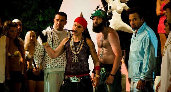 Qu’on se le dise d’emblée : Fatal n’a strictement rien d’un coup marketing, et surtout, Youn ne stigmatise jamais sa détermination revancharde à grands coups de boule dans la tronche du spectateur. Bien au contraire, car, dès le premier visionnage du film, une évidence s’impose : cette comédie est moins celle d’un escroc cherchant à tout prix à revenir dans la course à la célébrité que celle d’un authentique amuseur public qui connait son sujet sur le bout des ongles. Avec, surtout, l’envie surpuissante de cracher dans la soupe et de n’épargner personne, à commencer par lui-même. Les mauvaises langues auront beau trouver là-dedans l’énième caprice d’un idiot qui souhaiterait faire son intéressant pour redevenir le n°1, ce sera peine perdue, tant le film est totalement à l’image de son auteur : excessif, outrancier, couillu, mal élevé, et de temps en temps contradictoire dans ses excès. En plus de cela, on ne s’étonnera pas trop de retrouver le personnage de Fatal Bazooka au coeur de ce projet : ce rappeur savoyard, qui incitait les jeunes à mettre leur cagoule pendant l’hiver sous peine de choper la pire des gastros, présentait un décalage et une dimension enfantine en accord parfait avec l’intrigue. Et l’intrigue, elle raconte quoi ? Ni plus ni moins que le principe des trois « R » : la réussite, la ruine et la résurrection d’un empereur du rap, vulgaire et bling-bling jusqu’à l’overdose, con comme un robinet et d’une régularité assez hallucinante dans la propension à chuter de son piédestal. Car voilà, dès qu’un obstacle de taille se ramène devant sa piscine à trois cent patates, rien ne va plus : l’artiste électro Chris Prolls, rival invraisemblable au look de Van Damme métrosexuel (il parle souvent en franglais), qui vit bio, mange bio, défèque bio, fait de la musique bio et se donne une image d’artiste engagé, quitte à vendre des disques pour soi-disant guérir les koalas atteints du sida.