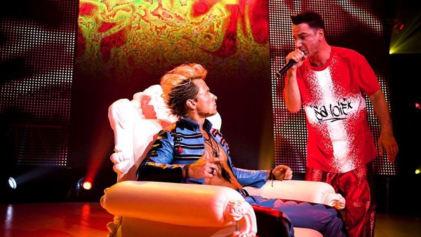Reste l’influence de la comédie américaine sur tout ce généreux shaker trash, qui, malgré une réception globalement positive du film, n’a pas manqué de susciter l’indignation des fanboys ne jurant que par Judd Apatow ou les délires trashouilles d’Adam Sandler. La comparaison s’impose d’elle-même en raison de la faculté de Youn à jouer du ridicule et de la crétinerie ambiante avec la même fureur jubilatoire qu’un Will Ferrell : en effet, l’influence de perles comme Anchorman ou Ricky Bobby se fait sentir à chaque plan, les deux comédies cultes d’Adam McKay ayant pris d’autres univers (le journalisme ou la course automobile) comme cadres d’un massacre jubilatoire des valeurs consensuelles par l’utilisation de la satire et de la caricature. Certes, Michaël Youn n’atteint pas le même niveau d’hilarité ou de méchanceté, mais ses excès, bien plus galvanisants que le dernier calembour merdique de Franck Dubosc, suffisent amplement à filer un sourire gros comme une patate pendant 1h30. Epaulé par des tas de nouveaux-venus (le génial Fabrice Eboué, l’insensé Jérôme Le Banner, la fracassée Isabelle Funaro) et par ses anciens collègues indispensables du Morning Live (dont le totalement shooté Vincent Desagnat), l’interprète d’Iznogoud accomplit ici une transition dans sa carrière et semble avoir enfin trouvé sa voie, comme il le suggère lors de la chanson pré-générique de fin. Son film est celui d’un type sincère et finalement plus attachant qu’il n’en a l’air, désormais bien conscient de ses failles et de ses mauvais côtés, mais qui continue d’aller jusqu’au bout de ses délires sans laisser le public sur le bord de l’autoroute à fous rires. Tout ça pour dire que Fatal, eh ben c’est vraiment pas mal. Ouais, c’est bien, t’as vu…