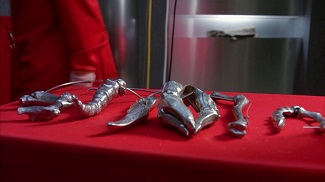 La présence de Claire (Geneviève Bujold), sorte de troisième tête qui transforme la figure siamoise en hydre tumultueuse, tend donc à écarter ces deux entités, à les dissocier pour les emmener vers un territoire inconnu. Le fait qu’elle entoure son utérus trifide d’une analyse très freudienne (cette anomalie vectrice de stérilité serait la réponse de son corps à cet état psychique qui l’entraîne vers des relations sadomasochistes) rend la situation encore plus trouble, l’humiliation qu’elle dit vouloir désirer s’opérant ici avec un attirail chirurgical (des garrots et des pinces en lieu et place des cordages et des chaînes) et prenant l’aspect d’un accouchement « à vide ». Mieux encore : lorsque Elliot met les choses au clair avec elle, son obsession à lire l’existence comme un « rôle à jouer » gagne en relief. En effet, l’entendre reprocher à Claire d’avoir « introduit un élément perturbateur, voire destructeur, dans la saga des frères Mantle » prouve bien que l’existence des deux frères n’est au fond qu’une création scénarisée et Claire un pur aiguillage narratif qui honore par sa seule immixtion dans le récit la fonction d’un bon scénario (en gros, jouer le plus possible sur les ruptures de ton et les déviations narratives). Son nom et son prénom sont aussi des indices en soi : elle est « claire » et « niveau » dans le sens où elle est consciente du danger à rester près des frères Mantle (« manteau » au sens littéral, « mental » au sens phonétique) et de l’élévation qu’elle représente aux yeux d’un Beverly de plus en plus enclin à s’émanciper de son frère. A partir du point de rupture qu’elle incarne, plus rien ne va : d’une part, Elliot choisit de délaisser quelque peu la clinique pour un poste plus prestigieux, et d’autre part, Beverly se réfugie dans le sommeil et la drogue à défaut des bras d’une Claire trop longtemps absente à cause de son travail. L’un est en danger. Les deux sont en danger. Leur réussite, jusqu’ici indéniable, se mue peu à peu en échec lorsqu’un grave incident, survenu lors d’une délicate opération chirurgicale, les prive du droit de « pratiquer la chair ».