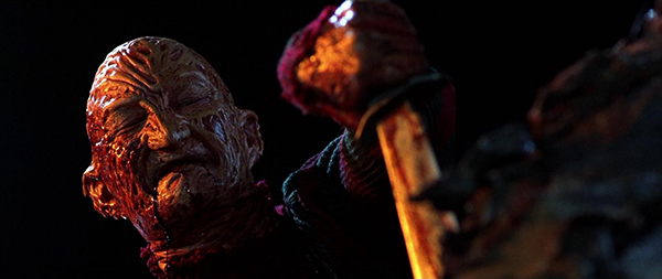 A ma gauche : Freddy Krueger (Robert Englund), véritable fuck face vivante, tueur d’enfants maxi-pervers, sextuple médaillé d’or en punchlines beaufs ante-mortem, dont la faculté consiste à pénétrer les rêves de ses victimes pour les massacrer de la façon la plus effroyable – et la plus drôle – possible. A ma droite : Jason Voorhees (Ken Kirzinger), sorte de machine à tuer gorillesque au regard vide, avec masque de hockey sur la tronche et dix résurrections sur le CV, qui avance sans dire un mot avec sa machette aiguisée, histoire de zigouiller à gogo du crétin qui s’encanaille avec une régularité de gosse attardé qui trace sa route dans la nuit obscure. De ce fait, on devine bien le « truc » : faire se rencontrer ces deux-là ne peut pas embrayer fissa sur un match grandeur nature – l’impasse narrative serait alors décisive. L’esquive choisie pour amener peu à peu à ce duel est assez géniale : ses cibles de toujours n’ayant plus cauchemardé depuis un bon moment (les enfants ont été secrètement drogués par leurs parents), Freddy a perdu toute son aura flippante et utilise donc Jason comme marionnette tueuse afin de se rappeler au bon souvenir des habitants d’Elm Street. Un monstre qui exploite la malédiction d’un autre monstre : l’idée est amusante, de même que vouloir à tout prix utiliser le relatif anonymat de Jason (qui charcute pépère avec un ego au point mort) pour mieux se faire remarquer colle très bien avec l’esprit vicelard de Freddy. Et comme Jason est du genre à ne jamais sembler être à sec en matière de meurtres, la suite est prévisible : trop de concurrence tue l’efficacité, alors il va falloir se saigner l’un l’autre, griffes contre machette.