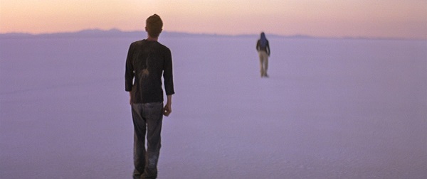 Film d’imprégnation, film-trip ou film-cosmos ? Les trois à la fois. Et pourtant, au premier abord, on ne sait pas comment le définir autrement qu’à l’état de mystère. Ce qu’il est appartient au registre de l’immatériel – doit-on y voir l’alpha ou l’oméga de notre art préféré ? Ce qu’il raconte se rattache au domaine de l’intemporel – est-ce l’origine ou la fin du monde ? Ce qu’il procure comme effets et sensations est sans commune mesure sur tout cinéphile désireux de lire son rapport à un film comme un trajet avant tout sensitif et subjectif. En somme, Gerry semble venu d’ailleurs, tel un météorite d’une composition chimique inédite aux yeux de tous, et c’est très bien ainsi. On se sent déjà ailleurs rien qu’en découvrant le plan d’ouverture, où ces deux jeunes hommes silencieux filent en voiture sur une route désertique, dans une ambiance ouatée sur fond d’une partition lancinante d’Arvo Pärt. Pas grand-chose à l’écran, et pourtant tout est déjà tangible : un mystère actif, une angoisse sourde, une émotion simple, et surtout la beauté absolue des décors désertiques (ceux de l’Argentine et de la Californie) qui fait se fondre l’élémentaire et le cosmique, le minéral et le solaire, le concret et l’abstrait, via une ligne d’horizon qui divise chaque cadre du film. L’horizon est d’ailleurs ici l’épicentre du doute figuratif qui régit tout le film : ligne de fuite ou ligne en fuite ? Sortie limite d’un labyrinthe sans limite ou terminus illusoire d’un trajet dérisoire ? En tout cas un trait qui, soumis à sa propre évaporation par un œil – celui du marcheur et celui du filmeur – qui perd tous ses repères, rend tout l’environnement désertique mouvant comme jamais. Aucune exagération là-dedans : on a beau sentir toute la matière concrète du monde (espaces, matières, météo, temps…) et tous les efforts de ceux qui s’y déplacent (marcher, courir, s’orienter, s’égarer, errer, chuter, souffrir, résister, survivre…), c’est la sensation même du lieu, abstraite à souhait, qui mène la danse et assomme la perception. Ce travail fou sur la lumière et les jeux d’ombre, cette danse accélérée des nuages dans le ciel, cette disparition exponentielle de la végétation (à la fin, il n’y a plus qu’un désert de sel), tout semble ordonner un rapport métaphysique au monde, visualisant l’humanité comme « surveillée » par un cosmos qui la dépasse, telle le centre d’un cercle dont le périmètre serait le X d’une équation trop grande pour lui. Après tout, Sacha Guitry ne disait-il pas que « ce qui donne le mieux le vertige, c’est le vide » ?