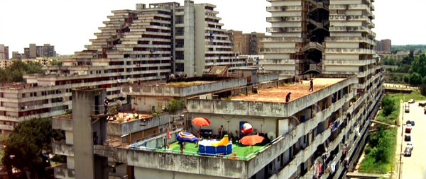 Cinq histoires qui, chose assez rare dans un film à dimension chorale, ne vont jamais s’entrecroiser par un quelconque artifice narratif, le scénario se limitant à une superposition d’intrigues juxtaposées où seuls quelques lieux et personnages reviennent parfois de façon furtive, au détour d’un plan ou d’un coin de cadre. On retient toutefois un épicentre géographique : la cité populaire de Casale Di Principe, située dans la banlieue de Naples, où s’articulent les différentes destinées sur lesquelles le film se concentre. Un décor qui, à lui tout seul, résume le processus de fonctionnement de la Camorra : une immense entreprise criminelle au taux record d’assassinats qui s’insinue dans la vie des classes les plus modestes (voire les plus pauvres), qui prend l’allure d’un serpent venimeux se faufilant sous le vernis des apparences, comme un danger que l’on craindrait sans être capable de le définir. Et tout au long de son film, qu’il se focalise sur tel ou tel personnage, Garrone fait de sa caméra aussi bien un témoin passif, vierge de tout jugement et concentré sur la captation des faits, qu’un outil servant à briser la frontière de l’invisible, ce que sa mise en scène, toujours vivante, illustre à merveille en se délimitant le plus souvent sur un vaste jeu d’oppositions entre ce qui se voit et ce qui se cache. Par exemple, dans une scène, la caméra filme Roberto en train de dériver tranquillement sur ce qui semble être une banale gondole vénitienne, puis se baisse pour révéler l’intérieur (plus large et plus souterrain) de cette gondole où son patron entretient un dialogue à la limite de la manipulation. Et un peu plus loin, alors qu’une poignée de camorristes semblent manigancer quelque chose sur un étage de la cité, la caméra se détourne en bas à droite de l’écran pour épier un mariage heureux où tout le monde fait la fête. Toujours cette idée d’une société basée sur le simulacre et la dissimulation, où gratter le vernis des apparences révèle une belle odeur de soufre.