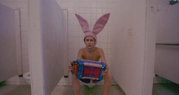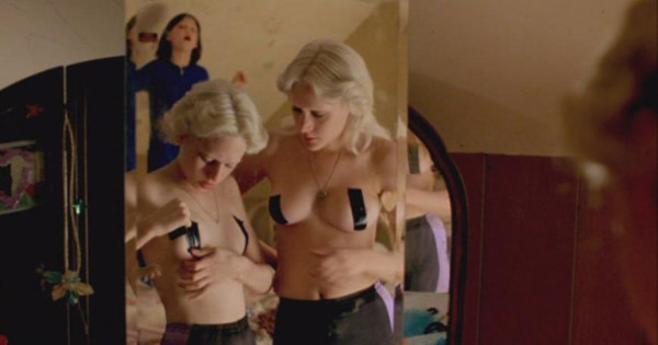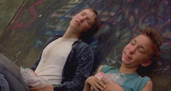 Ici, il ne se passe rien d’extraordinaire. Juste une poignée d’ados plus ou moins paumés, pour ne pas dire ravagés et esquintés, que l’on retrouve au fur et à mesure des scènes. Quelques exemples : deux gamins qui aiment exterminer des chats (pour les revendre ensuite à un boucher) et sniffer de la colle à bois, un duo de musclés adeptes du soulèvement d’haltères et de la violence gratuite, une gamine violée par son père, deux jumelles (dont Chloë Sevigny, également costumière du film et compagne de Korine à l’époque) fascinées par les chats du quartier, quelques rednecks chauves qui revendiquent leur haine des Noirs (à part ceux qui sont leurs potes) et fracassent des chaises lorsqu’ils perdent au bras de fer, un tandem de garçons zinzins qui jouent les terreurs tout en débitant mille insanités à la seconde, une attardée mentale transformée en prostituée par son mari, un ado qui s’occupe de sa grand-mère catatonique tout en se travestissant en cachette, une albinos à lunettes fumées qui fantasme sur Patrick Swayze, etc… Et au beau milieu de cette galaxie dérangeante, une figure énigmatique qui traverse le métrage sans réelle justification : un enfant d’une douzaine d’années avec des oreilles de lapin, que l’on verra jouer de l’accordéon dans des toilettes publics, descendre une ou deux rues en patin à roulettes, et surtout, uriner torse nu du haut d’un pont sur l’autoroute tout en fumant une clope (cette scène constitue le générique inaugural du film).