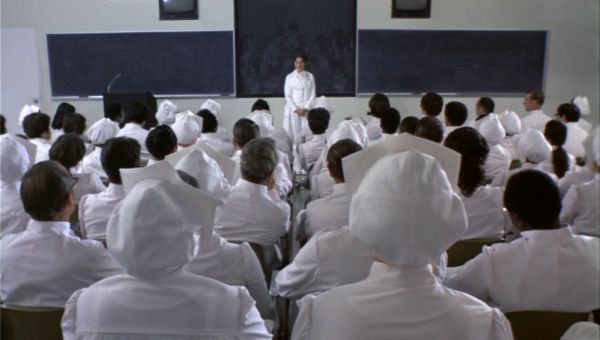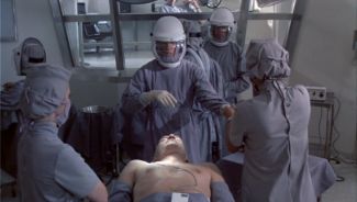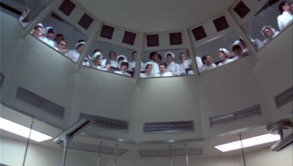 Évidemment, cette utilisation du blanc était logique au regard du contexte hospitalier de la première partie. Toutefois, elle n’est pas la seule manière dont Hodges épingle le comportement du personnel médical. L’exposé de l’opération au début du film est éloquent. Au lieu d’une rencontre en chair et en os, les docteurs font défiler une série de photographie de Benson. Cela met d’office une distance en place. Benson est d’office introduit comme un cas de maladie à guérir et non un individu à soigner. Hodges force ainsi son casting à exprimer le moins d’émotion et d’agir de la façon la plus fonctionnelle possible. Lors de la fête censée célébrer la réussite de l’opération, on ne voit que des visages fermés. Pas de rires ou même de sourires, aucunes discussions enjouées. Le succès n’apporte pas la moindre sensation particulière. Hodges achève de tourner en dérision cette retenue lorsque le patient s’échappe. Alors que la panique commence à gagner les médecins, ils se retrouvent obligés de chuchoter pour ne pas déranger le sommeil des patients. Quand bien même la situation est exceptionnelle (ce que dénote leurs tenues de soirée dans le cadre désinfecté de l’hôpital), les règles s’imposent à eux et étouffent littéralement l’expression de leurs émotions.