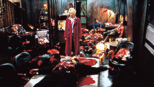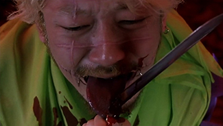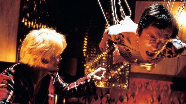 La seule présence de ce personnage suffit donc à tout parasiter, à tout pervertir, en particulier ce qui sous-tend le genre ultra-populaire auquel le film souhaite se connecter. En effet, le code d’honneur des yakuzas, selon lequel il faut laver l’honneur du chef éliminé par la vengeance, est ici découpé façon sashimi, de même que toutes les conventions du yakuza-eïga, jusqu’ici identifiées et honorées par de très grands cinéastes comme Kinji Fukasaku ou Takeshi Kitano, passent l’une après l’autre à la moulinette Miike. C’est que le cinéaste utilise Kakihara comme un double à peine voilé, visiblement incapable de rater une occasion de sadiser tout ce qu’il touche, comme en témoigne cette hallucinante torture gratuite d’un yakuza anonyme (joué par Susumu Terajima, acteur récurrent de… Takeshi Kitano, tiens, comme par hasard !), ici suspendu nu à des crochets par un bourreau rigolard qui lui transperce à peu près toutes les parties du corps avant de l’ébouillanter avec de l’huile ! Et ça ne va pas s’arrêtera là : peu de temps après, ce n’est pas le petit doigt que Kakihara va devoir se trancher pour s’excuser de la gratuité de son acte, mais carrément sa propre langue ! Ce qui ne l’empêchera pas ensuite de répondre pépère à un coup de téléphone, conscient que « le corps humain se régénère » (ah ?) et articulant tant bien que mal en crachant de grosses qualités de sang sur le lino – cela donne une bonne idée de ce second degré trash visant à désamorcer l’ignominie de chaque scène.
