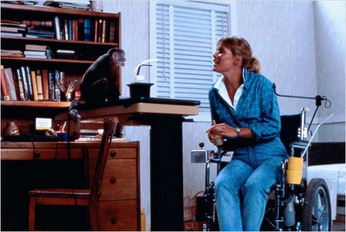 L’histoire est sacrément équivoque : un sportif baignant dans le bonheur (le succès ?) se retrouve dans une situation pathétique (l’échec) après avoir été renversé par une voiture. Tétraplégique, il devra compter sur l’aide d’un singe à l’intelligence incroyable, Ella, figure simiesque s’occupant de lui avec un amour quelque peu dérangeant. Situation d’autant plus déstabilisante que l’ami scientifique du protagoniste n’a pas manqué d’attribuer au singe quelques doses de liquide provenant tout droit d’un cerveau humain…Malgré l’affection d’une très jolie dresseuse, notre héros ne pourra rien faire contre le mal absolu qui le contamine : la haine qui immobilise son esprit… et se concrétise par des actes criminels commis par son macaque, extension bien réelle de son inconscient destructeur ! Violence envers une mère castratrice, violence envers une femme le trompant avec son médecin, violence envers tout élément perturbateur l’affligeant au fil des jours…Comment ne pas y voir l’état d’âme de Romero, qui n’a cessé de construire des ouvrages basés sur la survie oscillante, la décadence, l’humain réduit à l’état de chair ambulante ? Passant de métaphore d’un romantisme morbide quasiment poétique (ce baiser du singe porté sur la lèvre saignante de l’homme !) à perturbation mentale constante (une très tendre scène d’amour parasitée par des cris aigus de singes agités), le singe encouragera, lors d’un incroyable climax, l’Homme à revenir à un état terrible de régression…