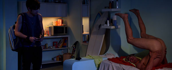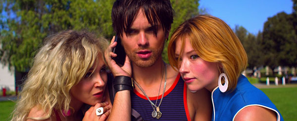 La bulle instable – et paradoxalement très cohérente – que constitue Kaboom ne se contente pas seulement de servir sur plateau multicolore une incarnation libérée de la jeunesse. Araki en fait surtout une pure question de mise en scène, n’hésitant pas à inonder l’écran de lumière fluo, à permuter ses choix de bande-son avec le degré de maniaquerie d’un DJ sous ecstasy (s’y croisent pêle-mêle les styles électro-rock respectifs d’Explosions in the Sky, Yeah Yeah Yeahs, Ladytron, Placebo ou The Big Pink) et à pulser le rythme de ses séquences verbales en épuisant le manuel des trucs et astuces du découpage cinématographique (split-screen, arrêt sur images, ralenti, fondu enchaîné, flashback, etc…). On notera même que ces éléments de mise en scène servent souvent d’outils transitoires entre une scène de sexe au visuel sans cesse surstylisé (pour ne pas dire d’un flamboyant onirisme) et une scène dialoguée pour le coup utile à l’avancée d’une intrigue totalement imprévisible. Sans doute parce que l’énergie de la première sert de Viagra sensoriel destiné à relancer la vigueur – et donc la crédibilité – de la seconde. Et sans doute aussi parce que les personnages du film, sans cesse sur le fil entre la tentation et la concrétisation du désir, sont comme des boules de flipper destinées à se rentrer dedans pour mieux « se relancer ». En témoigne, au beau milieu d’un Everest de dialogues aussi mémorables qu’hilarants, cette réplique grandiose d’une London flippée qui téléphone à Smith pour lui exposer son problème : « Tu peux venir chez moi ? Je suis stressée pour mon partiel demain et j’aurais besoin d’un énorme orgasme ! ».