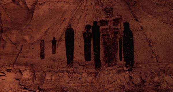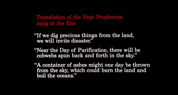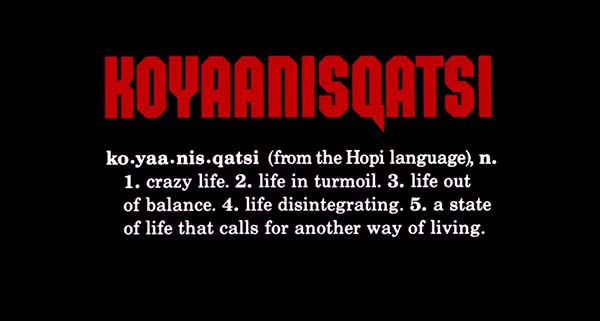 On s’en doute bien : lorsque le titre apparaît à l’écran, il est censé ne rien évoquer pour quiconque n’a jamais entendu parler des indiens Hopis. Le fait de l’entendre en boucle dans le thème musical – désormais mondialement célèbre – de Philip Glass qui accompagne la scène d’ouverture n’est là encore d’aucune aide pour le décrypter. Un choix on ne peut plus stratégique de la part de Godfrey Reggio : après avoir envisagé ne pas donner de titre à un film relevant de l’expérience non verbale, il opta pour un titre « culturellement neutre » dont la signification n’allait être révélée qu’en fin de bobine. Ainsi donc, ce nom tiré de la langue Hopi exprime, au travers de cinq définitions rapprochées, l’idée d’une « vie en déséquilibre », assimilable par analogie à une technologie qui aurait pris le dessus sur la nature. Trois prophéties Hopis accompagnent ici cette définition, et leur lecture en fin de film prouve bien que Reggio a voulu les utiliser comme métaphores directes. Un désastre enclenché pour ceux qui souhaite extraire des choses précieuses de la terre ? Rien de plus évocateur que des vidéos d’exploitations minières ou pétrolières et des visualisations de deux essais nucléaires, ici placées en amont de l’apparition du moindre être humain. Des toiles d’araignée tissées d’un bout à l’autre du ciel près du « Jour de Purification » ? Pas de problème : des décors de mégalopole urbaine et d’effervescence du « trafic » au sens large feront très bien l’affaire. Une apocalypse résultant du lancement d’un récipient de cendres depuis le ciel ? Les extrémités du film en donnent le « la » : tout commence par le décollage d’une fusée au ralenti, et tout s’achève par l’explosion de cette fusée en plein vol, capturant la chute lente et tournoyante d’un réacteur en feu – ici mis en parallèle avec un pictogramme amérindien qui se passe de commentaires.