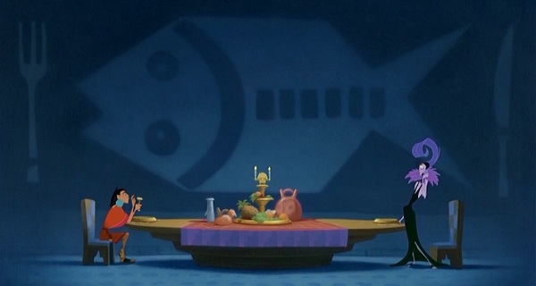 Rythmé à la manière d’un authentique buddy-movie shooté au gaz hilarant, le film fonce à pleine vitesse sans jamais regarder dans le rétroviseur. Pas un seul temps mort ne vient gâcher le visionnage du film, et la moindre seconde de relâchement se voit vite contrebalancée par un nouveau gag. Des gags qui, ici, touchent au sublime, les auteurs n’hésitant pas à convoquer les esprits de Tex Avery, de Chuck Jones, de Blake Edwards ou des Monty Python au détour de chaque scène. Il est important d’indiquer que, tout au long de Kuzco, la science du gag ne se limite pas à surligner celui-ci à la manière d’une sitcom, mais de jouer sur les variations de tempo, sur la position des acteurs dans l’espace, sur le moindre élément du décor qui pourrait intensifier la folie d’une scène. La scène du restaurant, de très loin la plus tordante de tout le film, épouse à merveille ce procédé : deux héros qui se livrent à un jeu de déguisement pour ne pas se faire repérer, deux méchants qui font une pause pendant leur traque, un menu à commander, des quiproquos à la pelle, des interactions malines entre le décor et les personnages, et surtout, un rythme frappadingue qui relance sans arrêt le déroulement de la scène. Très peu de films, si l’on excepte quelques grandes perles du genre (The Party, La cité de la peur, etc…), avaient su développer une mécanique comique aussi forte, aussi maîtrisée, faisant dériver peu à peu le décalage d’une scène vers un gros n’importe quoi jubilatoire.