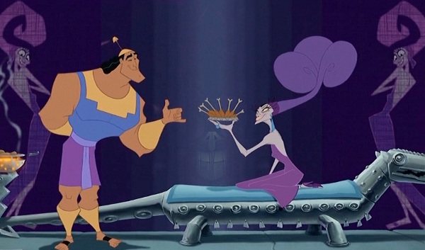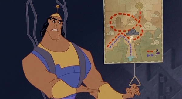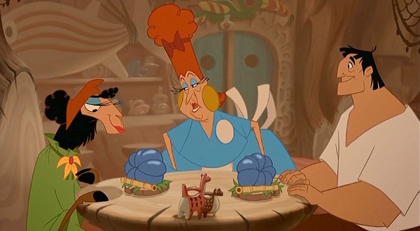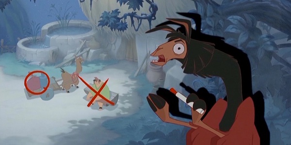 L’autre grande audace du projet aura été de construire la totalité de l’intrigue autour d’un personnage assez détestable : en effet, à travers une géniale scène d’ouverture qui contient d’ailleurs la seule chanson du film, Kuzco est un jeune empereur inca, présenté comme égoïste, mégalomane, capricieux et pourri gâté, dont le quotidien consiste à se la péter sur son trône, à mépriser son peuple, à humilier ses subalternes (ou à les virer sans raison apparente) et à faire tout ce qui lui passe par la tête. Il casse l’un de ses jouets ? On se calme, une douzaine de personnes sont là pour lui offrir le même juste après. Il souhaite avoir plus de pouvoir ? Pas de problème : il lui suffit de renvoyer sa conseillère Yzma, qu’il imagine un peu trop ambitieuse au point de désirer prendre sa place au plus vite. Il lui manque une grande piscine ? Aucun souci : on convoque le chef du village voisin, on lui annonce en trente secondes chrono que son village va être rasé dans une semaine pour laisser place à la résidence secondaire de l’empereur, et on se fiche éperdument du reste. Sauf que le jour où Yzma, irritée par le comportement de cette tête à claques couronnée, le transforme en lama sans le faire exprès lors d’un assassinat déguisé en pot de départ, il n’y a plus que le chef du village voisin, nommé Pacha, pour espérer remettre Kuzco sur le trône (et sur le droit chemin, tant qu’on y est…).