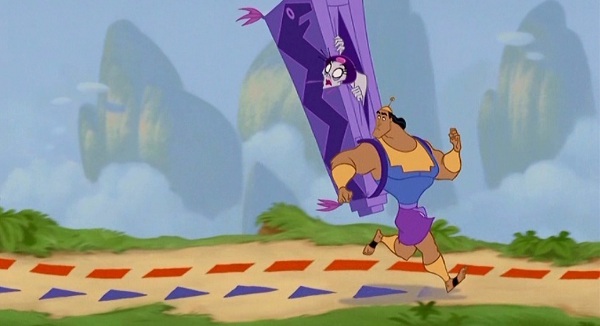 Au fil de la réflexion, on peut facilement percer une des raisons qui ont poussé les initiateurs du projet à partir autant en vrille : la production ayant vu son délai raccourci à moitié (deux ans au lieu de quatre !) et la première version du scénario ayant fait un vol plané pour atterrir dans la poubelle, il leur était assez facile de se concentrer sur les gags et les numéros d’acteurs. Du coup, la sensation d’inachevé que l’on peut ressentir tout au long du film, notamment un nombre de décors très limités (un palais, une jungle, un village, et… c’est tout) et un graphisme presque aussi pauvre que celui du catastrophique Hercule, se transforme vite en avantage : la simplification des traits permet d’épurer le cadre, le minimalisme des effets laisse une totale liberté d’action aux personnages, l’absence de perspectives 3D délaisse les scènes d’action au profit d’une pure mécanique de dialogue, et un récit volontairement simplifié, basé sur l’évolution plus ou moins positive d’un héros plus ou moins négatif, abolit toute possibilité d’y voir des enjeux humains hyper développés (ou mal développés, si l’on considère que Disney n’a jamais fait dans la finesse…). Le pari était gonflé, mais en simplifiant tout pour se focaliser avant tout sur les numéros d’acteurs et l’efficacité de la narration, le studio allait enfin faire preuve de culot et d’originalité. Une folie qu’ils ne retrouveront d’ailleurs plus jamais par la suite, si l’on excepte les collaborations avec Pixar.