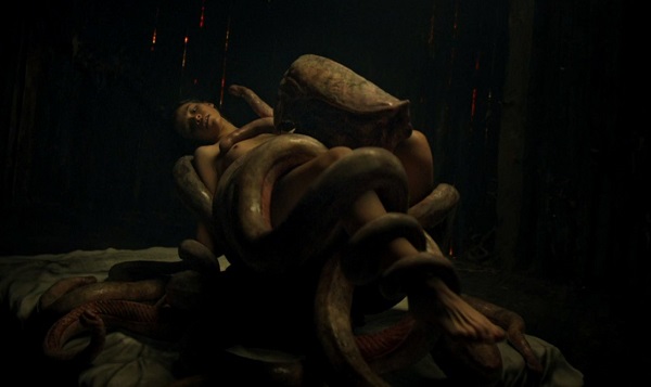Le contact avec la créature proto-Giger en question, mêlant bestialité et sexualité, n’obéit pas au même principe qu’Alien. Loin de chercher à utiliser l’être humain comme un incubateur, ce monstre né d’une matière apparue sur Terre à la suite de la chute d’un astéroïde (d’où le plan inaugural) ne vise rien d’autre qu’un plaisir total et transgenre, laissant ses tentacules en forme de vers visqueux et phalliques serpenter sur tout le corps humain – homme ou femme – et le pénétrer par tous les orifices. Pour tous ceux ayant déjà tâté du shokushu au détour de leur exploration des recoins les plus adultes de la galaxie manga, une telle vision érectile ne surprendra qu’à moitié, quand bien même les brèves scènes en question, aidées par de stupéfiants effets spéciaux, déploient une puissance érotique hors du commun. Là où l’idée s’avère paradoxale vis-à-vis du contenu réaliste du film, c’est quand le mystère métaphysique qui devrait alors le retravailler se voit zappé au profit d’une clarification de l’aura et de la visée de cette créature, ici livrées sans ambiguïté au détour d’un simple dialogue. C’est que cette sorte de pieuvre alien se veut la matérialisation la plus pure de la part primitive de l’être humain : l’« essentiel », l’absolu au sens le plus large, impossible à restreindre ou à éteindre, dont l’extension sine die finit tôt ou tard par engendrer une lassitude d’où peuvent découler des accidents mortels – la blessure de Veronica en est donc le premier signe avant-coureur. Un constat des plus limpides qu’Escalante place ici en superposition d’une autre scène tout aussi édifiante, où le cratère terrestre formé par l’astéroïde devient le théâtre d’une hallucinante orgie animale, exacerbant les instincts primaires de la faune locale (chiens, chèvres, poules, oiseaux, serpents…). Si l’on ajoute à cela une forêt inquiétante où le symbole animal se mêle à une angoisse sourde amplifiée par les sons environnants et les forces obscures qui semblent s’y tapir, nous voilà revenus à la case Antichrist et à son exorcisme trash de nos angoisses les plus mortifères. Or, comme on le disait plus haut, c’est clairement du côté de Possession qu’il faut chercher un début de cousinage.