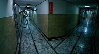 Les parenthèses musicales du film, censées illustrer les pulsions sexuelles des personnages sous un angle très fantasmatique (exemple : l’acteur de porno devient une créature sous-marine qui chante sa mélancolie face à la pleine lune !), sont donc loin d’être aussi accessoires qu’elles en ont l’air. Leur surgissement à des articulations précises du montage aide à dessiner ce moment où la vérité du sentiment, soudain tangible et révélée, acquiert assez de poids pour écraser la force du grotesque. Là-dessus, Tsaï joue bien sûr avec cette vieille définition du 7ème Art visant à considérer une chose toujours plus universelle à partir du moment où elle est traitée par le prisme de son contraire. Et cela lui réussit, tant le dérèglement interne de chaque personnage n’est ici jamais aussi bien retranscrit qu’au travers ces chorégraphies un peu ridicules. De même que la mise en scène, abusant de la courte focale et des perspectives sophistiquées, se révèle ici des plus diaboliques pour dessiner une vérité des échanges à travers la déformation mêlée des décors et de ceux qui s’agitent dedans. On relève ici beaucoup de trajets marqués par la figure du cercle : des ponts circulaires, des escaliers en spirale, et surtout ces plans de couloirs adjacents, construits en écho selon des effets de répétition dans le découpage, et cadrés selon une perspective en « V » qui évoque presque la forme d’un vagin – on se croirait presque chez Antonioni. Il y aurait également fort à dire sur ces innombrables plans fixes, où le jeu sur le premier plan ou l’arrière-plan suffit à conférer à chaque personnage le relief d’un animal écrasé par son environnement, d’une souris piégée dans une sorte de labyrinthe intérieur. Et comment ne pas penser au cinéma de Jacques Tati lorsque l’installation d’un gag dans le cadre se fait par le biais des variations de la bande sonore et de ce jeu d’attraction-répulsion envers l’architecture moderne ?