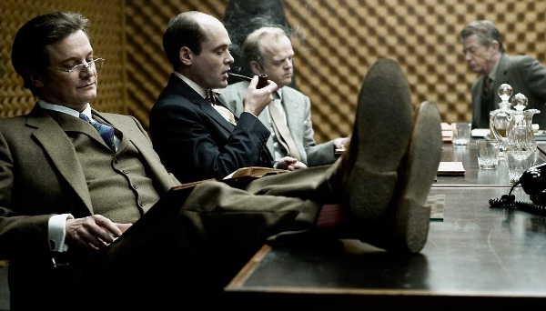 Le film n’a commencé que depuis quinze minutes, mais il en est déjà à son sommet. Une intro prodigieuse où Alfredson bâtit la moindre scène de suspense avec la rigueur métronome d’un Hitchcock, s’attardant sur des silences lourds, des regards fixes et surchargés d’ambiguïté, des gestes millimétrés ou des éléments diffus (un air de musique, une main qui tremble, une goutte de sueur qui perle, etc…), où l’action consiste en un étirement progressif de la tension ne menant qu’à un choc attendu, et où les personnages sont tous croqués avec subtilité et mystère au sein d’un cadre froid et désincarné. Le décor du Cirque, vaste bâtiment égaré en plein milieu de Londres, suffit à planter une atmosphère dès le générique pour en accroître la portée jusqu’à la fin du récit : environnement à la rigueur bureaucratique, murs grisâtres, imperméables délavés, costumes taillés sur mesure, salles insonorisées révélant l’isolation psychologique de ses hommes de l’ombre, odeur de café noir et de tabac froid, bande-son jazzy à base de piano et de trompette, etc… Tout y est, y compris les codes classiques du genre, tel les regards silencieux traduisant aussi bien le respect que la suspicion, ou les sonneries stridentes du téléphone au beau milieu de la nuit. Tomas Alfredson n’évacue aucun détail exploité par l’ensemble de ses prédécesseurs, mais va s’attacher à les isoler progressivement dans le cadre pour se focaliser sur la psychologie de ces maîtres de la dualité, dont George Smiley, espion solitaire qui a basé toute sa carrière sur le décryptage permanent du double-jeu, s’impose rapidement comme le pivot.