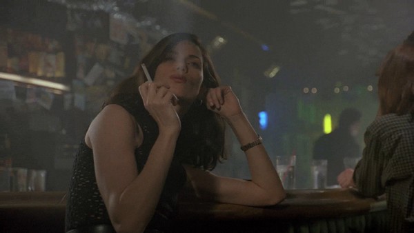 Dès la première scène, on a tout pigé : cadre dans une société d’assurances new-yorkaise qui démarche des clients par téléphone, Bridget s’impose en executive-woman au tempérament de dominatrice, qui houspille ses sous-fifres réduits à faire du chiffre. Silhouette classe, jambes interminables, longue chevelure brune, tailleur strict, timbre vocal à la Lauren Bacall, zéro filtre dans les répliques vachardes comme dans les clopes à fumer. Une battante tendance prédateur, donc, mais qu’on devine sans foi ni loi lorsqu’elle dérobe à son imbécile de mari le fruit d’une vente de drogue et prend fissa la poudre d’escampette pour un trou paumé de Pennsylvanie, là où elle change de nom et monte un piège terrible en domptant un jeune veau romantico-niais du terroir. Côté personnages, tout le film noir est là : la créature sans scrupules, l’époux sans relief, l’amant sans acuité. Mais on sent bien que la figure de la femme fatale, autrefois caractérisée par un trouble certain qui pouvait donner du crédit à son envie de se jouer de tous, n’a et ne cherche cette fois-ci aucune excuse, forte d’une intelligence supérieure qui lui fait systématiquement dénicher la faille d’untel et anticiper les réactions des autres. Dans ce gros jeu d’échecs où la belle est la seule à avoir un coup d’avance, on remarque que la reine est le roi, au sens littéral. Elle se comporte comme un homme, et pour cause : de son propre aveu, Linda Fiorentino aurait travaillé son personnage de salope ultime en s’attribuant ce qu’un sondage réalisé auprès des femmes recensait comme les travers les plus odieux chez un homme. La voir ainsi « tâter la marchandise » lors de son premier contact avec un Peter Berg encore jeunot (et pas encore réalisateur hollywoodien) ou lâcher un tonitruant « Il faut sucer pour boire un verre ou quoi ? » à un barman qui fait mine de ne pas la remarquer permet de sonder chez elle des réflexes très macho dans l’âme. Des réflexes qu’elle détourne et reprend à son avantage.