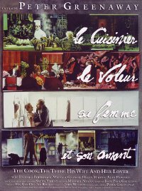 Concrètement, avec ce film, Greenaway semble opérer le lien parfait entre théâtre et cinéma, du moins dans la scénographie et l’utilisation des mouvements de caméra. Sur les bases d’une représentation à la fois théâtrale (le film débute et s’achève avec un lever et une tombée de rideau) et cinématographique (la virtuosité du filmage est un pied-de-nez audacieux au statisme d’une pièce de théâtre), le film s’impose à la croisée de différentes sensibilités artistiques comme à la croisée de plusieurs genres : la comédie sociale à l’italienne (des personnages odieux et répugnants créent aussi bien le rire que le malaise), le drame sentimental (un amour interdit voué à la pire tragédie), le film d’horreur (coprophagie, défécation et cannibalisme prennent place dans ce récit), la fable fantastique (la cuisine filmée comme le réceptacle d’une multitude d’ambiances, féériques ou horrifiques) ou le manifeste esthétique (sur ce point précis, le film est d’une splendeur baroque assez étourdissante). En outre, les nombreux travellings latéraux ont également une fonction précise dans ce brouillage entre théâtre et cinéma : opérer, en un seul mouvement de caméra, une véritable progression d’une scène « de théâtre » à une autre, le tout dans une même scène « de cinéma », montée et découpée à la manière d’un métronome. A première vue, chaque décor s’avère si pointilleux dans ces détails, si expressif dans sa colorimétrie, que tout semble faire penser à une pièce de théâtre filmée. Or, en cassant la règle du changement de plateau par une suite de travellings d’un décor vers un autre, Greenaway donne presque une alternative malicieuse au « plateau tournant », très fréquent au théâtre. Tout n’est qu’affaire de mouvement d’un décor vers un autre, et pour passer du monde extérieur au restaurant, aucune alternative possible : entre les deux, il y a la cuisine, véritable espace-temps qui sert de lien diffus entre la fonction principale de l’homme (en gros, se nourrir) et sa concrétisation dans un lieu (le restaurant) s’accordant à ses désirs. Et à chaque nouveau mouvement de caméra, on pénètre dans cette cuisine, laquelle ressemble de plus en plus à un dépotoir au fil des scènes.