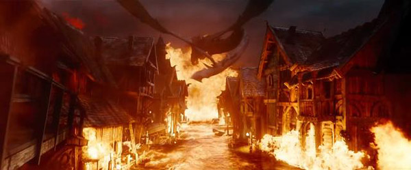 Concernant La Désolation De Smaug, nous avions émis de grosses réserves sur sa conclusion. Logiquement, l’ouverture de La Bataille Des Cinq Armées en fait les frais. En déconnectant la destruction de Lacville de l’histoire précédemment contée, le pauvre Smaug voit sa formidable personnalité sacrifiée. Il ne devient plus qu’une simple silhouette monstrueuse sans caractère. Il est heureux qu’un ultime échange entre le dragon et Bard vienne lui redonner son aura démoniaque. C’est précisément ce face-à-face qui semble justifier le choix de Jackson d’inclure la séquence dans La Bataille Des Cinq Armées. En effet, cette confrontation annonce ce qui constituera la nature de cet ultime épisode. Ayant récupéré la flèche noire capable de tuer le dragon mais perdu son arc dans l’action, Bard va élaborer une arbalète de fortune utilisant son propre fils dans le mécanisme. Bard vivait jusqu’alors dans la honte de son ancêtre qui n’a su protégé la ville lors de la première attaque de Smaug. Alors que les paroles de ce dernier tentent de le complaire dans sa médiocrité (renforcé par la taille démesurée de la créature se déplaçant dans la ville entièrement dévorée par les flammes), le lien se créant entre le père et son descendant va révoquer cet héritage déshonorant.