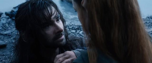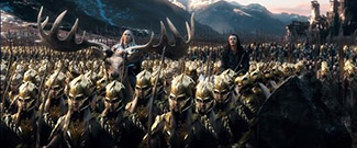 La Désolation De Smaug tournait autour de la résurgence d’un mal auquel personne ne prêtait attention. La Bataille Des Cinq Armées aurait logiquement pu poursuivre le travail en parlant de la nécessité à faire face à ce mal. Or, cette orientation semble beaucoup trop simpliste pour Jackson et ses scénaristes. La Bataille Des Cinq Armées ne se concentre pas sur cette notion de devoir incontournable mais plus globalement sur les conséquences du mal. Que se passe-t-il lorsque la collectivité est soumise au plus grand des malheurs ? Ce malheur ne peut-il engendrer que d’autres malheurs supplémentaires ? Au contraire, ne pourrait-il pas devenir un générateur d’espoir ? A l’issu de la séquence d’ouverture, les rescapés de Lacville trouvent un nouveau souffle avec l’avènement de Bard comme leader. Dans le même temps, ils sont prêts à lyncher Alfrid qui est l’ultime représentant d’une ancienne autorité synonyme d’oppression. Le film joue constamment sur les paradoxes et marie ensemble les émotions les plus opposées. Le spectacle cherche à accomplir les plus grands écarts de ton, offrant tout autant de la pure tragédie (la trajectoire de Thorin et sa famille) que de la comédie monty pythonesque (toutes les apparitions d’Alfrid).