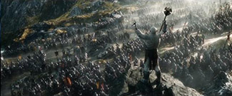 C’est définitivement les personnages qui ont la part belle. Au lieu d’accorder toute son importance au gigantisme de la bataille, le récit se focalise sur les actes individuels se déroulant dans celle-ci. La thématique de la réaction au mal se constitue par le décorticage de ces parcours personnels. Il en résulte une sensation de ne pas contempler un tableau d’ensemble mais des détails qui se révèlent néanmoins primordiaux dans sa compréhension. La Bataille Des Cinq Armées raconté par Jackson devient une collection de moments tiraillant le spectateur entre exaltation et désespoir. Un instant de coopération entre deux personnages jusqu’alors opposés peut ainsi céder la place à une démonstration de pur égoïsme. La résolution de la romance entre Tauriel et Kili résume parfaitement toute cette ambivalence, la concrétisation de leur amour s’accompagnant de la plus profonde tristesse. Mais à ce petit jeu, c’est probablement l’issue de la bataille qui dénote toute l’intelligence de Jackson et ses scénaristes. Il y aurait de quoi s’offusquer par l’énième intervention opportune des aigles. Sauf que Jackson joue là avec ses propres règles et l’impact de ce deus ex machina est ici transfiguré. Choisissant de traiter leur arrivée par le point de vue de Bilbon, il relativise totalement leur importance. Oui, les aigles vont aider les forces du bien à triompher. Comme Pippin des décennies plus tard, il lance un « les aigles arrivent ! » mais celui-ci n’a aucun réconfort dans sa situation (l’image en plongée avec leurs ombres projetées au sol fait passé ces sauveurs pour des anges de la mort).