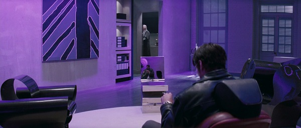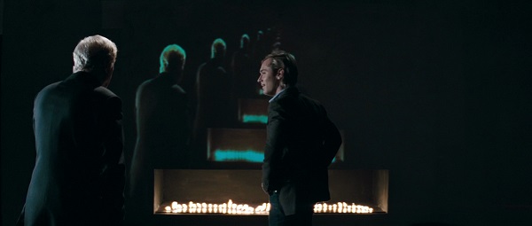 Là où certains autres films de Branagh avaient souvent de quoi tutoyer le zéro pointé en matière de spatialisation du décor, Le Limier fait un effet bœuf dès son premier quart d’heure. Au travers d’un intérieur high-tech et branché qui contraste avec l’allure victorienne de la façade extérieure, la production design génère un délicieux vertige, vite renforcé par l’omniprésence des outils de surveillance. Ce sont d’ailleurs ces derniers qui guident le découpage, en tout cas durant un premier acte qui reprend pourtant les grandes lignes de celui du film de Mankiewicz. D’entrée, le plan d’ouverture est une transformation en Scope d’un écran de caméra de surveillance (on découvre ici Andrew Wyke par sa main, comme si celle-ci était la continuité du décor lui-même), et Branagh va même jusqu’à utiliser ces écrans vidéo pour façonner des jeux de pouvoir par le simple effet de la scénographie (on se croirait chez Atom Egoyan). D’autant que Wyke, autrefois marionnettiste qui croyait tenir les règles du jeu, abuse ici des écrans et des boutons pour contrôler le décor à la manière d’un control freak. Ce détail n’est pas anodin, car il soulève une vraie ambiguïté dans la mise en scène : on aura beau voir par un écran les deux acteurs discuter dans une pièce, difficile de savoir si l’écran fonctionne tout seul ou si quelqu’un d’autre (Branagh lui-même ?) dirige le jeu de rôle. Le film est ainsi fait : jamais théâtral, mais toujours attaché à multiplier les angles et les perspectives au sein d’un décor à la lisière de la structure cubiste. Les idées scéniques de Branagh vont ainsi à l’encontre du surmoi théâtral, par le biais d’un audacieux système d’angles inhabituels, déclinés à loisir pour dynamiser le duel et déstabiliser le public.