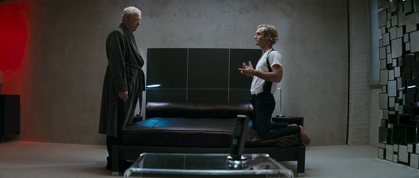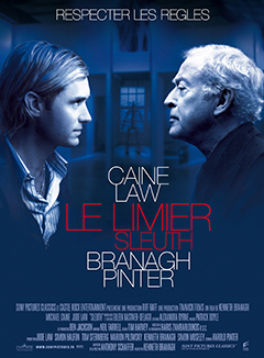 Tout cela augurait donc plutôt du meilleur pour permettre à cette relecture 2.0 du Limier de tutoyer – voire de surpasser – le brio de la précédente. Il aura hélas suffi d’un intrus à bord du paquebot de luxe pour que cette belle promesse se mange un vilain iceberg dans la tronche. On pourra certes tirer notre chapeau à Michael Caine, ici impérialement sobre et ambigu dans sa réinterprétation du rôle autrefois tenu par Laurence Olivier (jouer l’inversion des rôles lui réussit très bien), mais on ne pourra clairement pas en dire autant de cet indécrottable cabotin de Jude Law. Insupportable lorsqu’il s’efforce de ne pas rester sobre, aussi gesticulateur qu’un gamin capricieux de cinq ans dès qu’il s’agit pour lui de singer le gigolo sexy, ou roulant carrément les yeux comme un méchant de manga, l’acteur dévoile une prestation outrancièrement théâtrale, donc en infraction directe avec le parti pris du film. Sans parler du fait que son maquillage d’inspecteur mal rasé tutoie aisément le ridicule de celui de Peter Sellers dans La Malédiction de la Panthère Rose : son timbre de voix est si reconnaissable entre mille qu’on ne met pas plus de dix secondes à deviner qui est caché sous le latex. Par sa faute, Le Limier version Branagh loupe le grand film théorique qu’il aspirait sans doute à être, et se limite ainsi à un élégant jeu d’échecs, à la fois sexy et glacial. Cela en limite fatalement sa portée, car on espérait beaucoup plus que ça. Mais ça n’en atténue pas pour autant son efficacité.