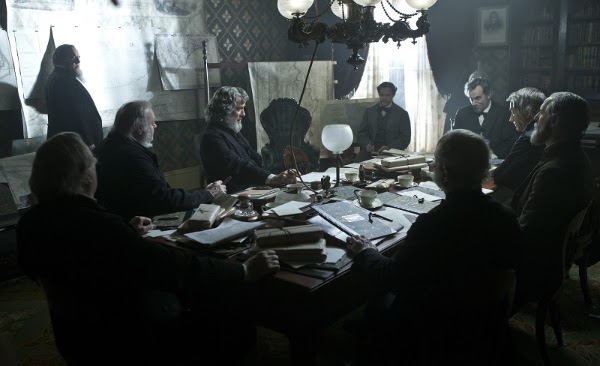 Au procès limite anodin de Vers Sa Destinée, Lincoln opte pour l’épisode majeur. En soit, cela est un choix logique afin de mieux cerner son personnage puisque proposant ici des liens directs et clairs entre sa pensée et ses actions. Une perspective rapprochée passant par un décryptage du jeu politique. Qui dit politique, dit idéologie et toutes les annexes qui vont avec : hypocrisie, immoralité, une juste dose de suffisance… Pour un film censé parler d’une des grandes étapes de l’histoire américaine, Spielberg et Kushner prennent toute la mesure d’inclure ces notions. Par certains aspects, on aura ainsi presque un guide sur l’art d’acheter des voix, de faire pression sur des personnes pour se les mettre dans sa poche et de décrédibiliser son adversaire par un bon mot. Le verbe est une arme et les nombreux débats du long-métrage en sont la démonstration. En un sens, il pourrait apparaître déplorable chez un cinéaste comme Spielberg de privilégier un verbiage aussi brillant soit-il au détriment de la notion du visuel. Après tout, c’est un peu cette noblesse du beau discours qui avait fait sombrer Amistad (comprenant néanmoins une poignée de scènes où le cinéaste se reprend en main). Le projet Lincoln ayant pris germe au lendemain de cette déconfiture, nul doute qu’il fut immédiatement pensé de ne pas reproduire les mêmes erreurs. Ce qui est fait par un usage de découpage et de photographie plus pointilleux que jamais pour éviter de s’engoncer dans un académisme à la Ron Howard. Il en va de même pour un casting dépassant le stade du festival des barbes et postiches tel qu’il fut proposé dans la bande annonce. On retiendra forcément en premier lieu la prestation de Daniel Day-Lewis dont la profondeur atteint le stade de l’hypnotique. Une véritable mystification en parfaite adéquation avec le personnage historique.