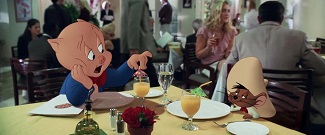 On en ressent les premiers effets dès les scènes inaugurales, enfilées comme des perles le long d’un fil narratif que Dante tisse à vitesse supersonique. Un cartoon qui soumet Daffy Duck à un carnage facial ininterrompu, sa prolongation dans le monde réel qui le montre se faire virer comme un malpropre par les pontes rondouillards de la Warner, sa révolte irraisonnée au sein d’un studio qu’il saccage une fois poursuivi par un cascadeur raté… Jamais manchot pour réécrire la dichotomie humain/toon en cohabitation zinzin impossible à freiner, Dante vise à transformer chaque scène en prétexte à une enfilade de gags nés de la folie du contact et de la confrontation, et ce sans autre possibilité d’arrêt que le fondu enchaîné ou l’écran noir. Tout le film exhibe ainsi sa matière, son principe, sa loi : mille actions en cascade vouées à inverser la logique interne de la scène, à faire dévier le récit vers des situations inattendues, voire même à soumettre les personnages à des métamorphoses tantôt inédites (on change souvent de look là-dedans !) tantôt sadiques (ça charcute presque autant que chez Bill Plympton !). On était aussi en droit d’attendre des Looney Tunes une torsion maline de leur programme habituel, et là aussi, tout est chamboulé en beauté. Les exemples valant mieux que les mots, faisons le tour des dégâts : Daffy Duck pilote la Batmobile dirigé par Roger Corman himself, Coyote passe plus de temps à faire exploser mille choses (surtout lui-même !) qu’à courser Bip Bip à travers les routes désertiques de l’Arizona, Taz transforme Hellboy en squelette, Sam le Pirate dirige son propre casino à Las Vegas où la garce blonde de Melrose Place joue les meneuses de revue, et même un Titi peut cacher un humain qui cache lui-même un Grosminet qui cache aussi le Michael Jordan de Space Jam qui cache pourtant le vilain du film qui cache en réalité… (oui, c’est sans fin).