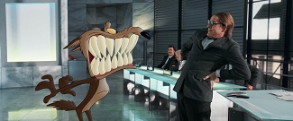 Face à des créatures de cartoon à qui il s’agit de tenir la dragée haute coûte que coûte, aucune autre option ne s’impose aux acteurs que celle de changer leur fusil d’épaule, optant moins pour la nuance que pour un sens aigu du too much. Ce jeu cartoonesque devait certes se caler dans le mood siphonné des Looney Tunes, mais donner surtout la sensation de voir le monde réel revu et corrigé par ce même degré de folie, un peu comme si l’ensemble devait basculer sans prévenir du film live au cartoon à l’état pur. Sans surprise, c’est à Steve Martin que ce cinglé de Joe Dante confère le soin de repousser les limites de la pantomime surjouée. Et là, on manque clairement de mots pour décrire le caractère over the top – aussi revendiqué soit-il – d’une telle interprétation. Capable de faire passer le Dr Denfer d’Austin Powers pour un parangon d’austérité bergmanienne, ce super-vilain ridicule opère un violent contraste avec tout autre humain prompt à rentrer dans le cadre, en particulier le meilleur interprète de James Bond à qui revient ici l’honneur de singer le super-espion beaucoup trop sobre et protocolaire pour remplir sa mission dans un monde dont la logique et les lois ont quitté la stratosphère. Point de repère à repérer dans le monde des Looney Tunes passent à l’action pour des êtres humains qui ne sont pas « animés », et par le biais de cet adjectif-là, on glisse un double sens qui éclaire tout. Les humains peinent ici à égaler l’énergie interne des Looney Tunes parce qu’ils finissent par devenir eux-mêmes les intrus de leur propre monde, refaçonné par autrui animé d’une vraie folie (et par des fous du gag). D’un bout à l’autre du récit, leurs émotions sentent le fake (quand elles n’ont pas l’air trop scénarisées), leurs réactions sont forcées (parce qu’il n’y a pas d’autre logique à suivre) et leur interprétation bute sur cette surface où les toons glissent tels des pros de la transgression. Un principe qui se voit d’ailleurs parfaitement résumé dans ce court plan fixe où Daffy pénètre dans un décor peint en deux dimensions afin d’échapper à un humain qui se mange le mur en essayant de le suivre. Reste que si les Looney Tunes font ici la loi, la compétition persiste aussi entre eux. Bugs Bunny a une carotte d’enfer et Daffy Duck déballe un Maxi Best Of de son incontournable registre de râleur agité, mais en fin de compte, c’est le second qui gagne par KO en s’imposant comme le vrai héros du film.