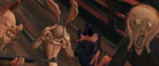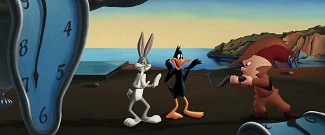 A ce titre, deux points d’orgue sont à relever dans cette narration infernale à plus d’un titre. D’abord une courte excursion de nos quatre héros dans un espace-temps invisible en plein désert d’Arizona, où la fameuse Zone 51 révèle sa nature de fantasme voué à dissimuler une authentique « Zone 52 » peuplée de toutes les créatures fantastiques imaginées par le 7ème Art. Dans ce laboratoire secret s’active alors la cohabitation désintéressée et bordélique de plusieurs régimes d’image et de citations : la couleur et le noir et blanc, le carton-pâte et la 3D, l’humain et le cartoon, le terrestre et l’extraterrestre, Roswell et Planète interdite, le sérieux et la distance, le réel et le cinéma. Bref, un espace-temps inédit où, le temps d’une scène, toutes les « formes » au sens large cohabitent sans effet de distinction, comme si quelqu’un mettait soudain sur pause la confrontation vénère entre humains et toons. Du moins avant que l’excursion suivante, située en plein musée du Louvre, ne réactive tout à coup le conflit animé en offrant au film sa scène la plus ahurissante : Daffy et Bugs qui voyagent de tableau en tableau pour échapper à cet indécrottable flingueur compulsif d’Elmer Fudd. Les voir pénétrer les peintures les plus célèbres et subir de plein fouet l’effet des techniques picturales sur leur nature de créatures dessinées est un régal : le surréalisme gluant de Dali, l’expressionnisme hurlant de Munch, le postimpressionnisme kitsch de Toulouse-Lautrec et le pointillisme minutieux de Seurat servent alors un savant jeu de contamination réciproque entre la citation et l’image, chacune cessant dès lors d’être « à plat » pour devenir une forme mutante qui auto-commente l’autre avec malice. Petit détail à relever : il n’y a pas un seul personnage non animé à l’œuvre dans cette scène. Preuve encore que le facteur humain n’a pas ici voix au chapitre.