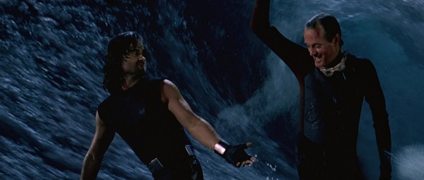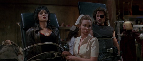 Cela dit, il faut d’abord y mettre les formes pour mieux faire baver son audience et flatter l’ego des grosses huiles qui ont sorti le chéquier pour donner vie à ce qui sera au final l’exact inverse du produit attendu. Figure centrale de ce produit vérolé de l’intérieur, cet indécrottable franc-tireur de Snake Plissken revient ici gonflé à bloc pour faire jouir de bonheur tous les geeks qui l’ont érigé en icône anticonformiste. Sanglé dans un manteau de cuir qui le rapproche autant de Barb Wire que d’un biker punk, le voilà qui lâche chacune de ses répliques comme une ode à la badass attitude, qui joue de la moto et du deltaplane avec des poses de crâneur qui font leur effet, et qui fait grimper son thermomètre nihiliste vers le rouge cramoisi, plus que jamais désireux de littéralement foutre en l’air le monde pour le simple plaisir de fumer sa clope. Autour de lui, le monde fait pitié : d’un côté un « ordre nouveau » 100% réac et puritain (pas de cigarettes, pas d’alcool, pas de drogue, pas de sexe hors mariage, pas de gros mots, pas de viande rouge…) avec à sa tête une suprême raclure de président ; de l’autre la décadente Los Angeles revisitée en ghetto de freaks hérétiques, dirigés par un Che Guevara disjoncté dont s’est amourachée la gourdasse de gamine du président US. Et l’enjeu fait flipper : une « boîte noire » capable de neutraliser toutes les sources d’énergie de la planète, et qui, tombée entre les mains du latino schtarbé, menace de renvoyer l’Amérique à l’âge de pierre. On pourrait croire que tout cela aurait l’allure d’un missile satirique expédié dans la face de ce fascisme ordinaire – sournoisement dissimulé sous une hypocrite chasse aux mille et un vices – que Carpenter porte en horreur, mais à bien y regarder, le film tient davantage du doigt d’honneur pur et simple.