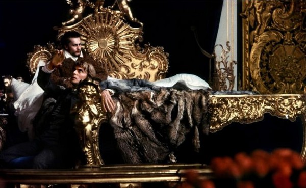 Cet isolement est rendu hautement fascinant par le fait que le monarque soit paradoxalement entouré en permanence. La manifestation de cette solitude croissante du personnage n’est donc pas donnée dans les faits montrés à l’écran puisque Visconti ne le film presque que dans ses confrontations avec les autres où chaque interlocuteur se révèle : la folie de plus en plus évidente de Ludwig, la perfidie de son entourage. Le processus de déchéance et d’isolement est rendu intelligible par le jeu monumental d’Helmut Berger, consacré icône viscontienne en seulement trois films (Les Damnés avant celui-ci, Violence et Passion après), et par la mise en scène. Tandis que l’acteur hisse la moindre mimique au rang de révélateur génial d’une chute psychologique et sociale, le cinéaste charge ses images jusqu’à un point de non-retour, où la folie, exprimée avec autant de force dans l’opulence matérielle et la démesure visuelle, ne se manifeste plus seulement à nous par indices intermittents mais nous prend littéralement aux tripes, par un puissant effet de catharsis. On pense notamment à ces images démentielles qui nous révèlent toujours un peu plus des exubérances dont regorgent les châteaux de Ludwig : une réplique de la Galerie des Glaces de Versailles, un lac artificiel sous-terrain où le souverain accueille le dernier artiste dont il s’est épris dans un bateau en forme de coquillage géant, etc. Autant que le caractère sous-jacent (ou plutôt transcendant aux faits décrits) de cette déchéance, c’est donc son caractère mégalomane qui surprend. Ludwig s’isole du reste du monde en s’en détachant par le haut, par la démesure de ses actions et de ses exigences matérielles, au point que, lorsqu’elle découvre la folie de l’un des immenses châteaux qu’il s’est fait construire en Bavière, sa cousine Elisabeth (magnifique Romy Scheider, qui reprend son rôle de Sissi) éclate de rire.