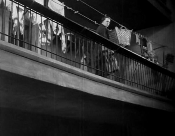 Mais la scène n’est pas terminée, et Lang suit cette mère dont on ne tarde pas à apprendre – par les seules images – qu’elle est blanchisseuse au foyer et que sa fille ne joue pas dans la cour mais est à l’école. Elle doit bientôt en rentrer. Elle n’en rentrera pas. L’attention portée à chaque détail figurant l’amour de la mère pour son enfant – auquel elle prépare son repas le sourire aux lèvres, qu’elle attend en regardant l’horloge de plus en plus fréquemment, etc. – est trop grande pour que l’issue de la séquence ne soit pas des plus cruelles. Lorsque l’attente tournera à l’angoisse et que la mère ne pourra se retenir de crier le nom de sa fille par la fenêtre, elle n’aura pour toute réponse que deux plans terribles et muets (comme après la mort d’un être cher, dont les objets et les lieux qu’il a connus disent l’absence) : une cage d’escalier vertigineuse, une cour violemment éclairée (on est bien face à un cinéma expressionniste) mais vide.