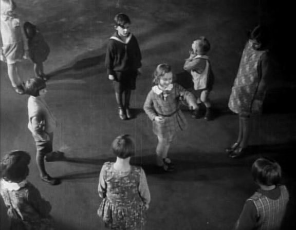 Le film commence dans le noir. Et c’est bel et bien une comptine qui le lance, en même temps qu’elle annonce le thème : « Attend encore un peu, le méchant homme noir viendra avec sa petite hache, il fera du hachis de toi… Tu es dehors ! » Une petite fille chante au milieu du cercle formé par d’autres enfants et exclut celui qu’elle montre du doigt du jeu. De la vie. Dans une seconde rotation autour d’elle-même, elle entraîne le mouvement de la caméra pour lancer l’histoire du film : celle de la petite fille qui va être tuée par le vrai méchant homme noir. Comme le grand Jean Douchet le montre dans une analyse de cette ouverture, le dispositif de la première séquence est monstrueux de précision : le cercle des enfants, dans la cour de l’immeuble, est dominé verticalement par un autre cercle, celui que forment les balcons du premier étage, tout autour de la cour, et depuis lequel une mère défend aux gamins de chanter une comptine pareille en des temps aussi noirs que ceux-ci, où un authentique serial-killer terrifie la ville. La construction géométrique de la scène est implacable, avec une silhouette jouant le rôle du Mal placée au centre de deux cercles de tailles différentes : la perversion, le crime, la mort frapperont les deux cercles concentriques.